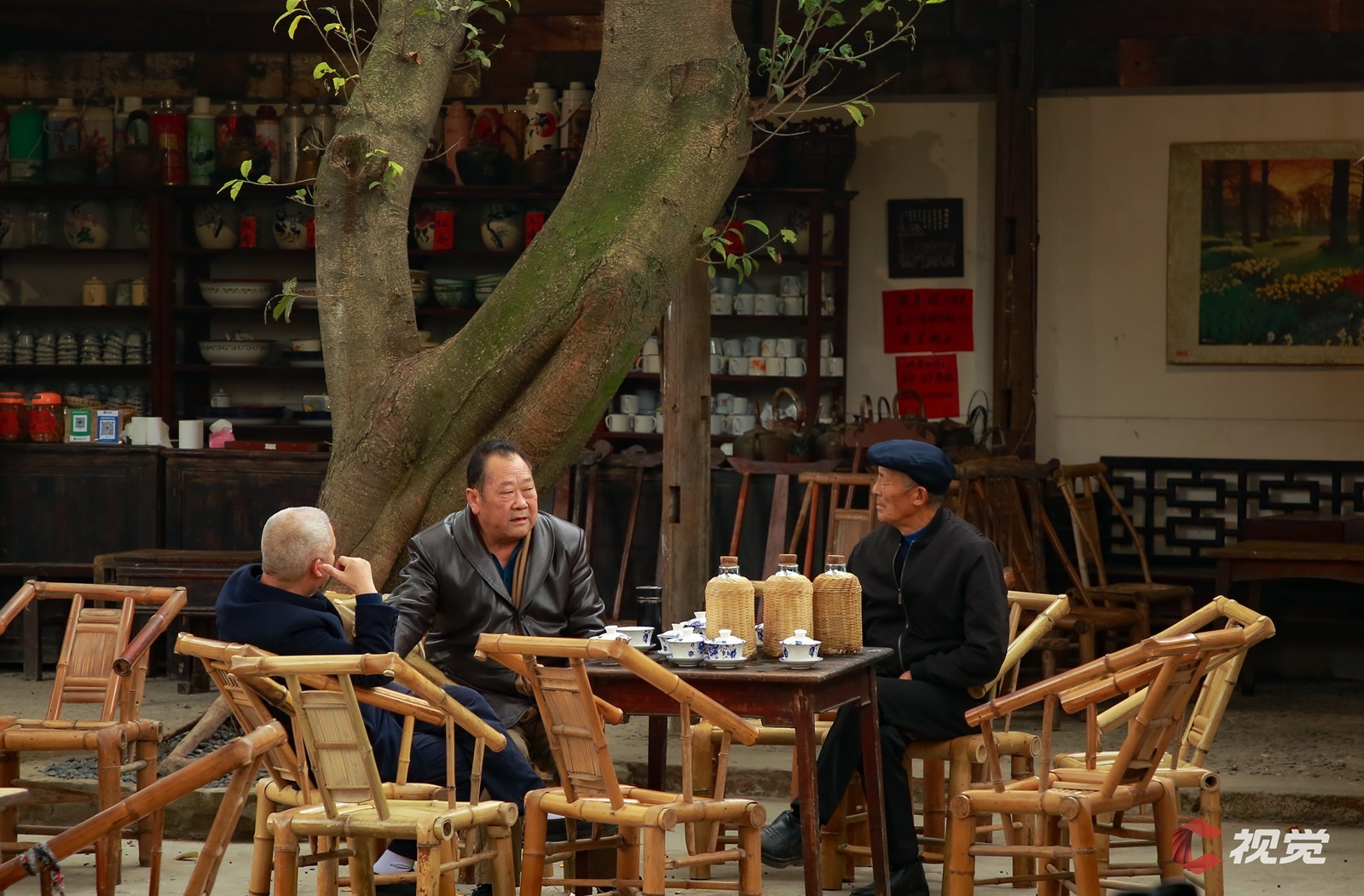 彭镇老茶馆内,木桌、木椅、青砖、石板,一切都充满了古色古香的韵味。阳光透过天井洒落下来,斑驳的光影洒在茶馆的角落。此刻,茶馆内人声鼎沸,热闹非凡,泡上一碗盖碗茶,或聚在一起聊天、或品茗、茶水沸腾声交织在一起,形成了一首生动的生活交响曲。