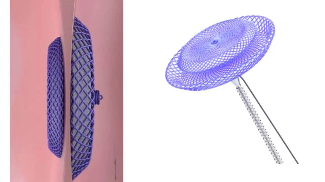 经过反反复复的尝试,最终把封堵器做成了双盘内凹结构,并通过高温热定型及特殊“锁扣”设计等,实现“非形状记忆的材料达到形状记忆的功能”。