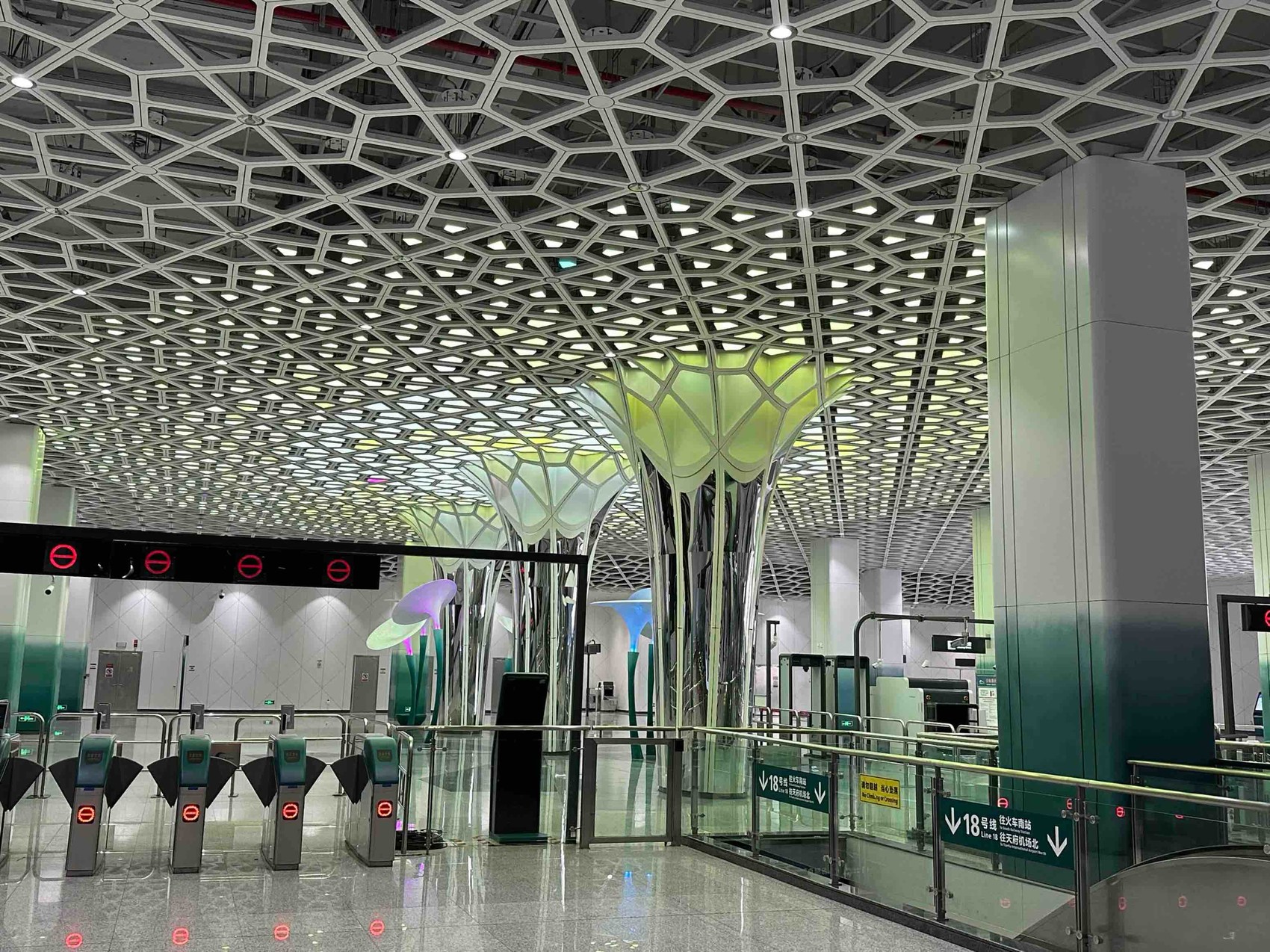 值得一提的是,站内艺术品以天府中心为设计主题,柱子、天花相结合,通过智能艺术灯光控制,以活跃内部空间色彩区分主体功能空间,描绘未来天府中心万花齐放的美好画卷。