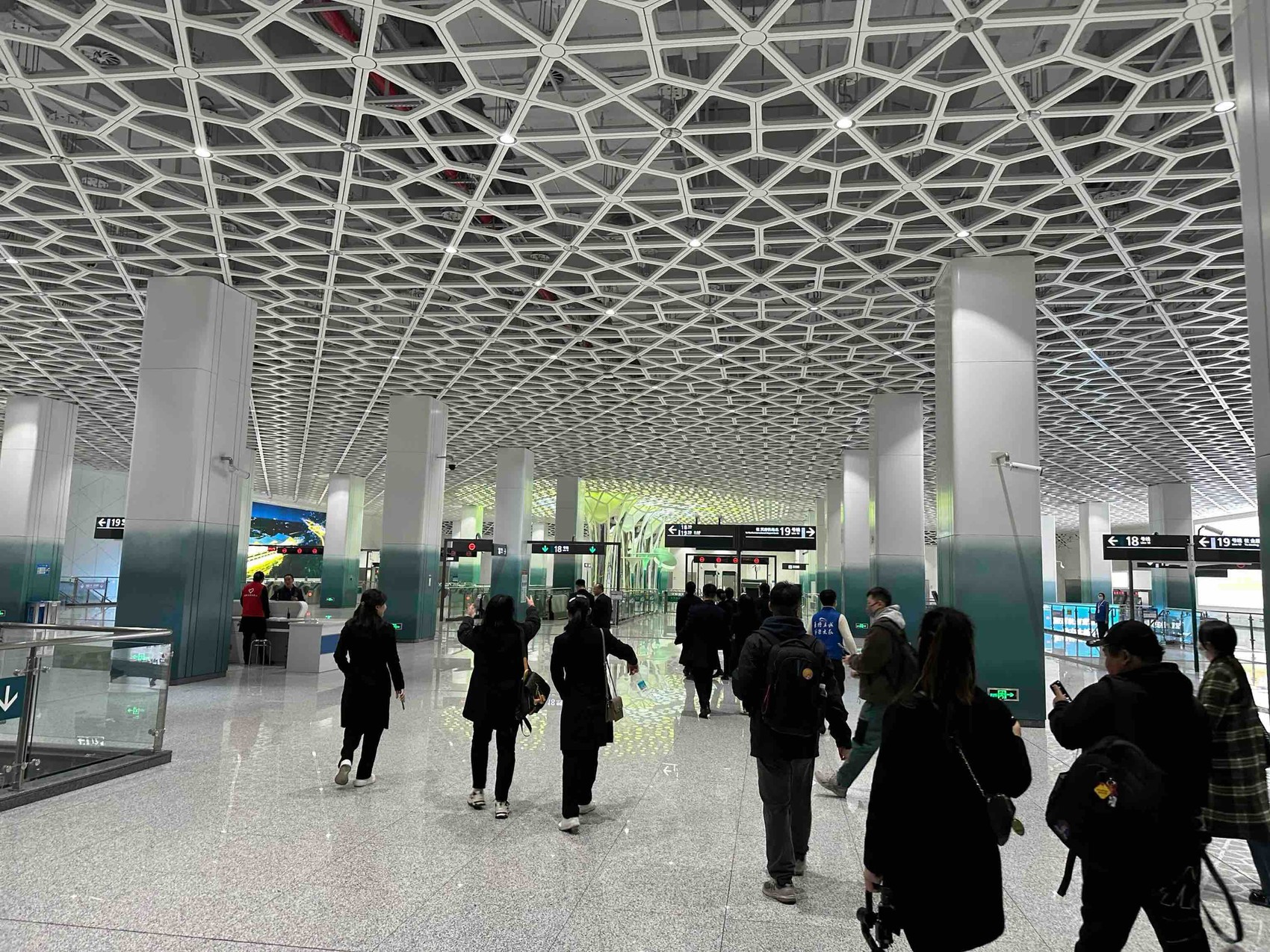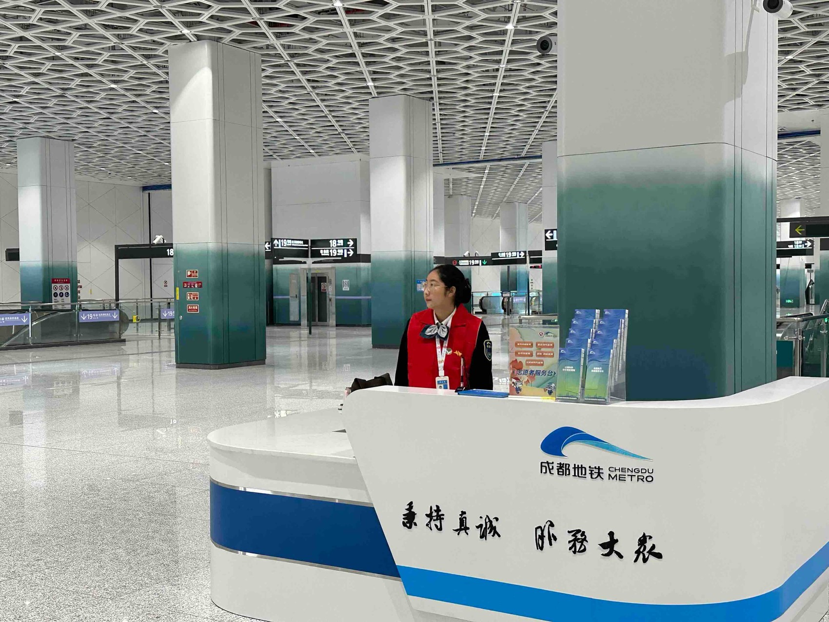 水墨渐变的立柱、白色明亮的灯光、熟悉温馨的提示语……走进天府站,一个多柱地下空间映入眼帘,各处别具匠心的设计令人眼前一亮。据悉,天府站是以“天府新城”为主题,提取“城市万花筒”设计元素,通过标准模块变化组合,采用参数化、一体化设计手法,以白色调为主打造的地铁空间。