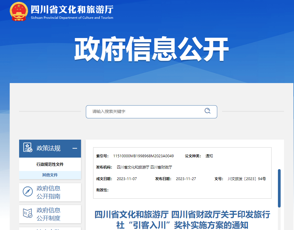 对2023年11月1日至2024年3月31日“冬游四川消费季”期间组织旅游团队来川的旅行社按每人次30元给予奖补。