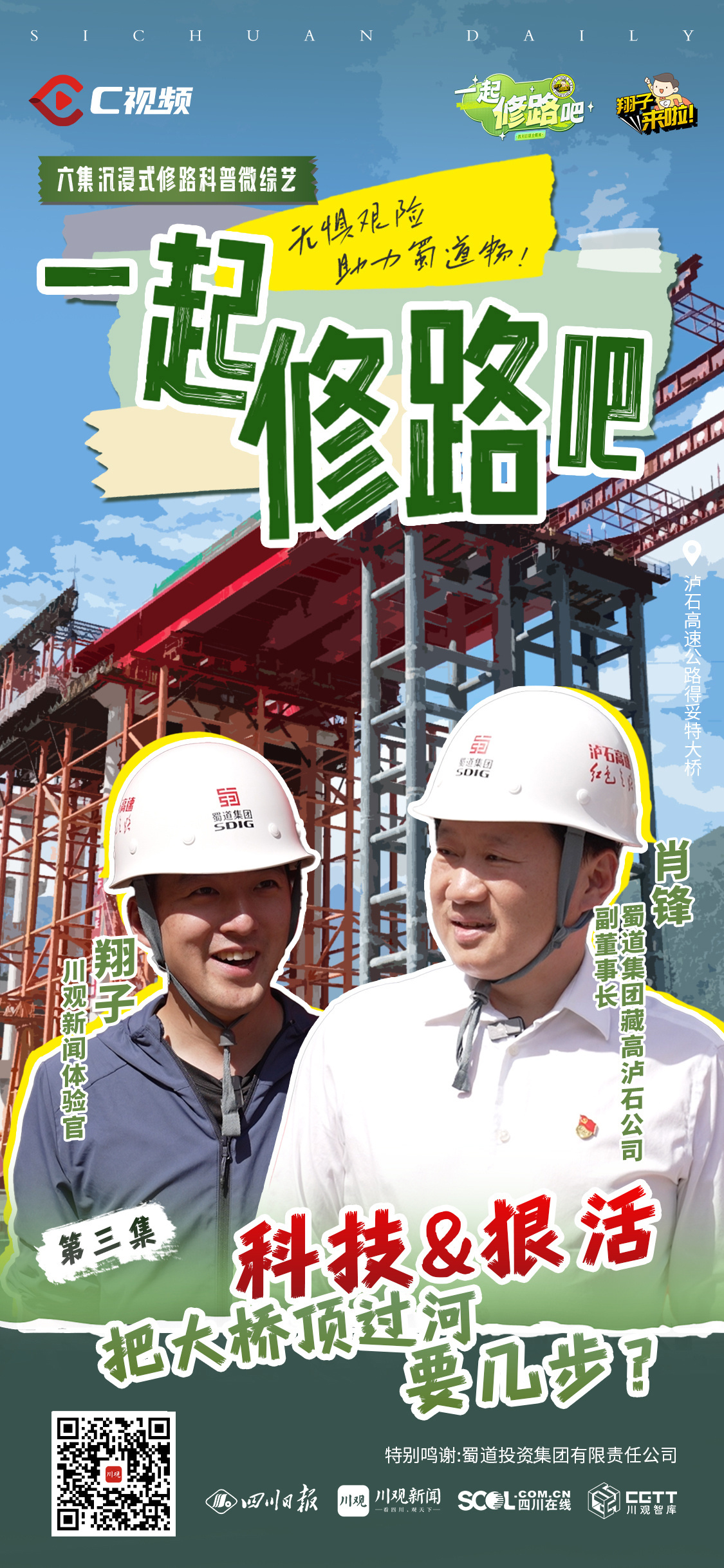 这一次,我们来到了泸定至石棉高速公路(以下简称“泸石高速”)重要控制性工程得妥特大桥,该桥位于“9·5”泸定地震重灾区,是距离震中最近的高速公路大桥。我们到达时,这里刚好开始钢箱梁的顶推施工。简单来说,就是要把638米长、7600吨重的钢箱梁吊到20层楼高的空中,然后从大渡河的泸定岸顶到石棉岸!这可不是个容易的事,还等什么,和修路小队,一起顶桥过河吧!