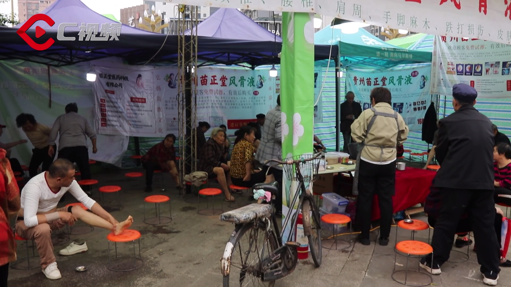 “贵州苗正堂风骨液”摊位前,很多人在用此药擦拭关节