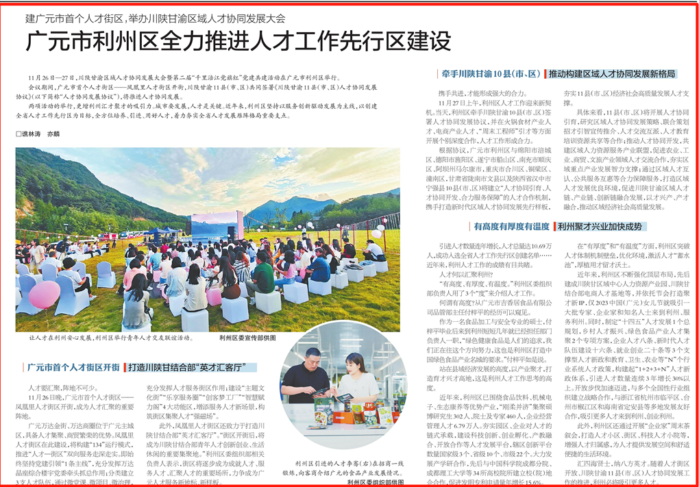11月29日,《四川日报》9版关注广元市利州区人才工作。近年来,利州区已围绕食品饮料、机械电子、生态康养等优势产业,“刚柔并济”集聚硕博研究生302人、院士及专家460人,企业经营管理人才6.79万人。