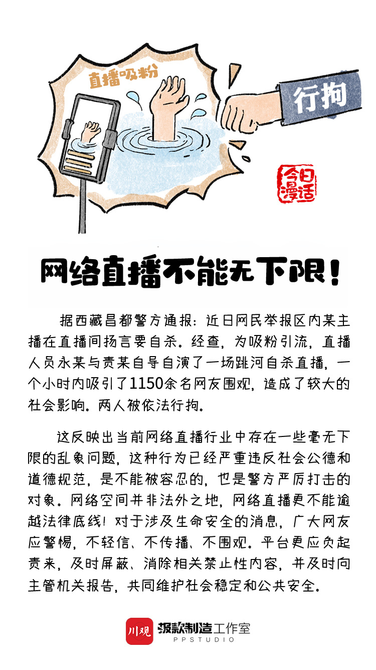 为吸粉引流,竟然自导自演跳河自杀直播。网络空间并非法外之地,网络直播更不能逾越法律底线!如此直播,你咋看?评论区留言来聊一聊吧!