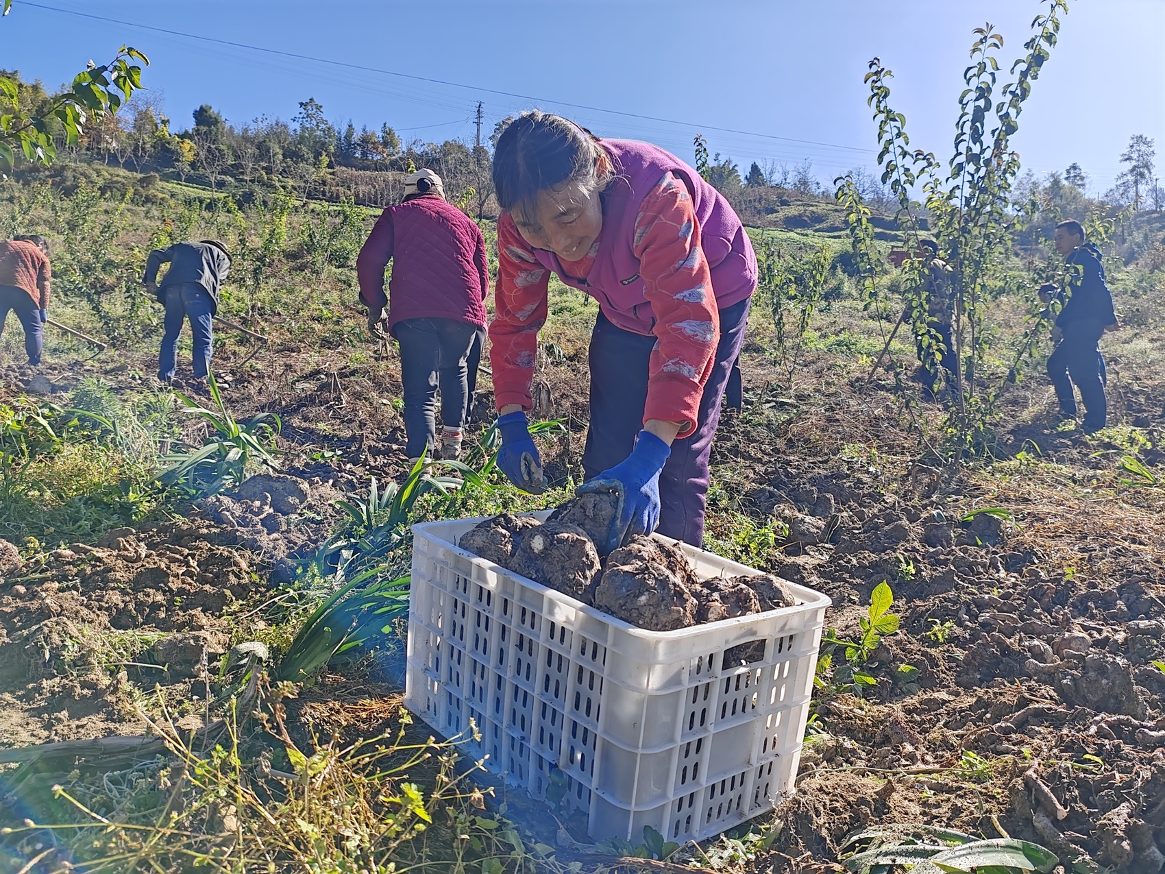 11月30日,平武县山区已开始降温,但古城镇白草村200余亩的魔芋基地里却显得生机勃勃,20余名村民有序分工,从魔芋采挖到分拣,再从现场品控把关到装车,一气呵成。很快,这批魔芋将被运送至位于古城镇农副产品加工园区进行加工。从出土到工厂,不到一天即可实现。