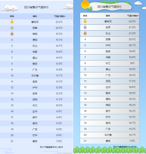 四川省气象台根据最新气象资料作出的预测结果显示,明后两天,四川盆地日最高气温将继续维持在10~15℃,大部分城市的日最高气温不会超过今天。