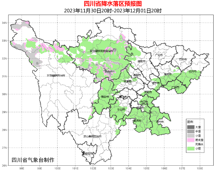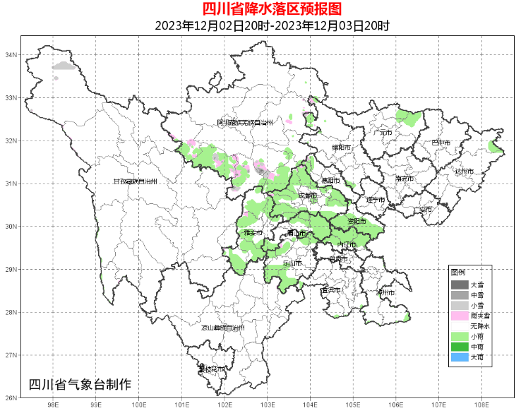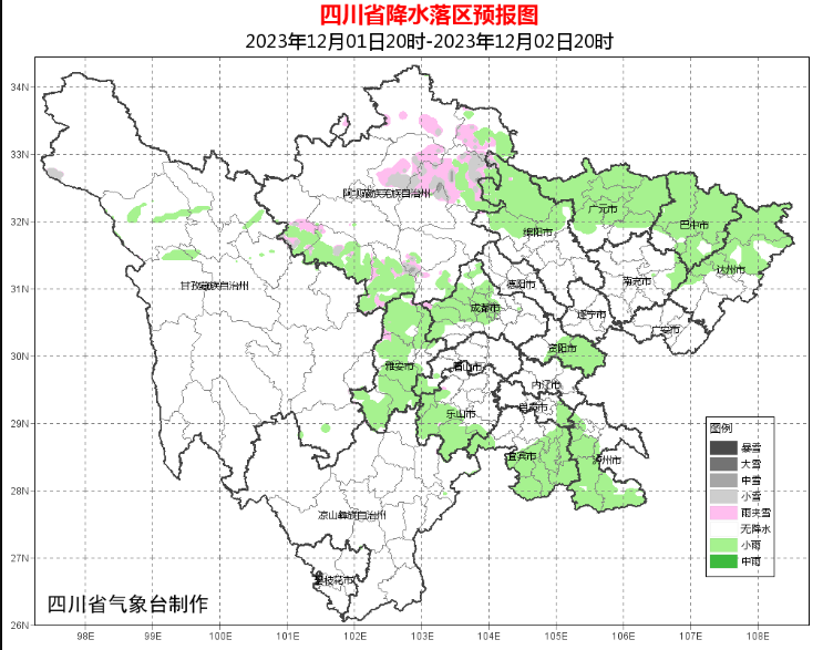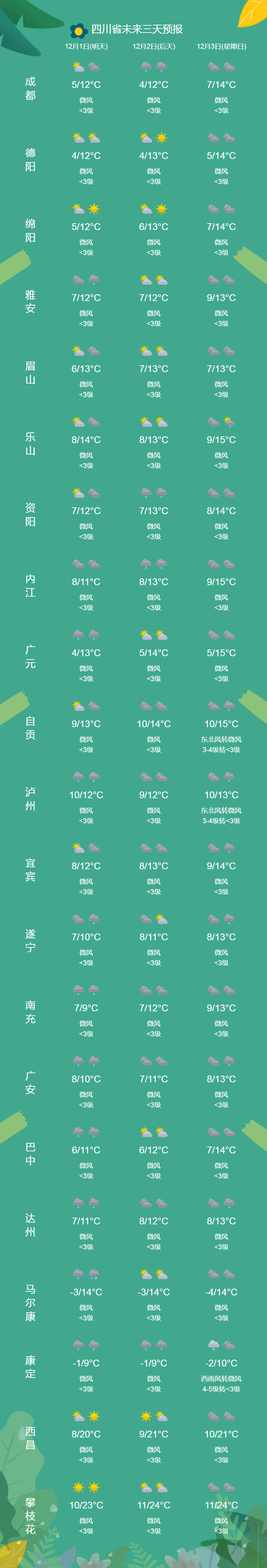 12月1日晚上到2日白天,盆地大部阴天间多云,盆周山区早晚有分散小雨;阿坝州东部南部多云间阴有分散阵雪(雨),川西高原其余地方和攀西地区多云间晴。