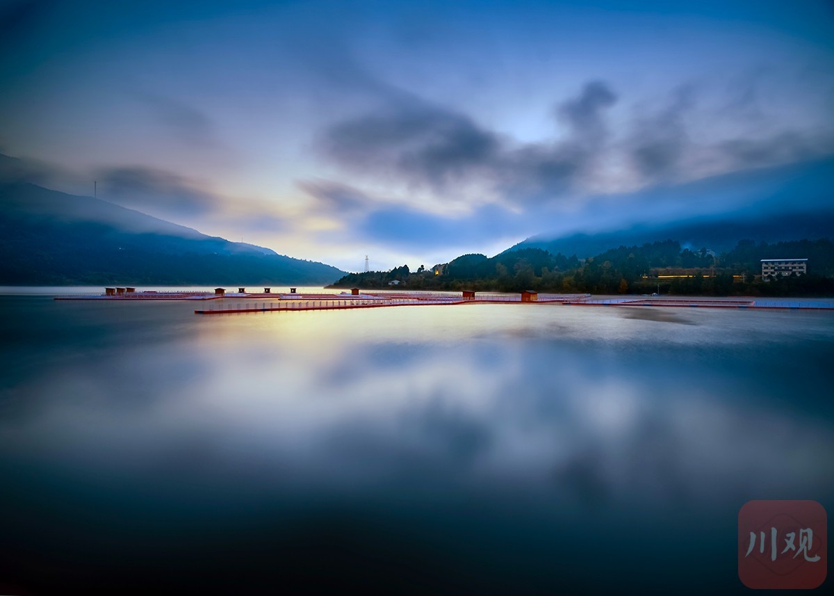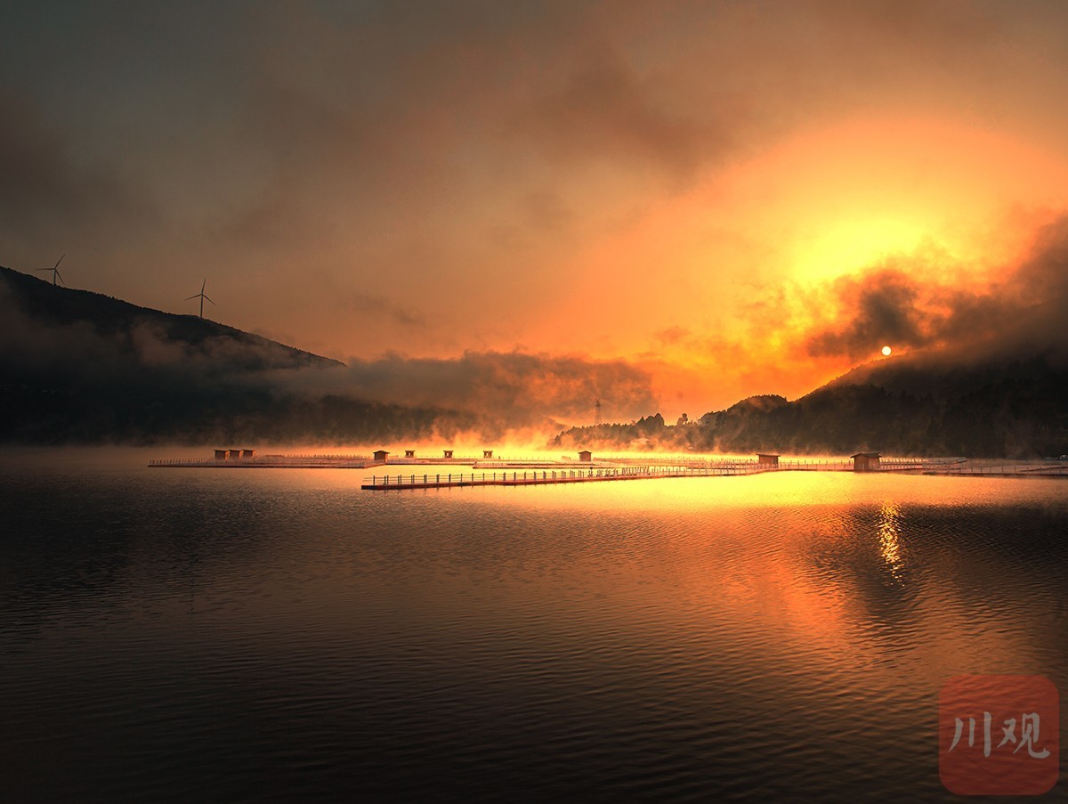 一路湍急奔腾的嘉陵江水,在这里变得异常平静。宽阔的湖面水域上,飘渺升腾的水雾将远山笼罩的时隐时现,犹似一幅重彩的水粉画;山顶的风力发电站在云霞中,活像一个个随风溜转的大风车,好一派如诗如画,如梦似幻的川北风光。