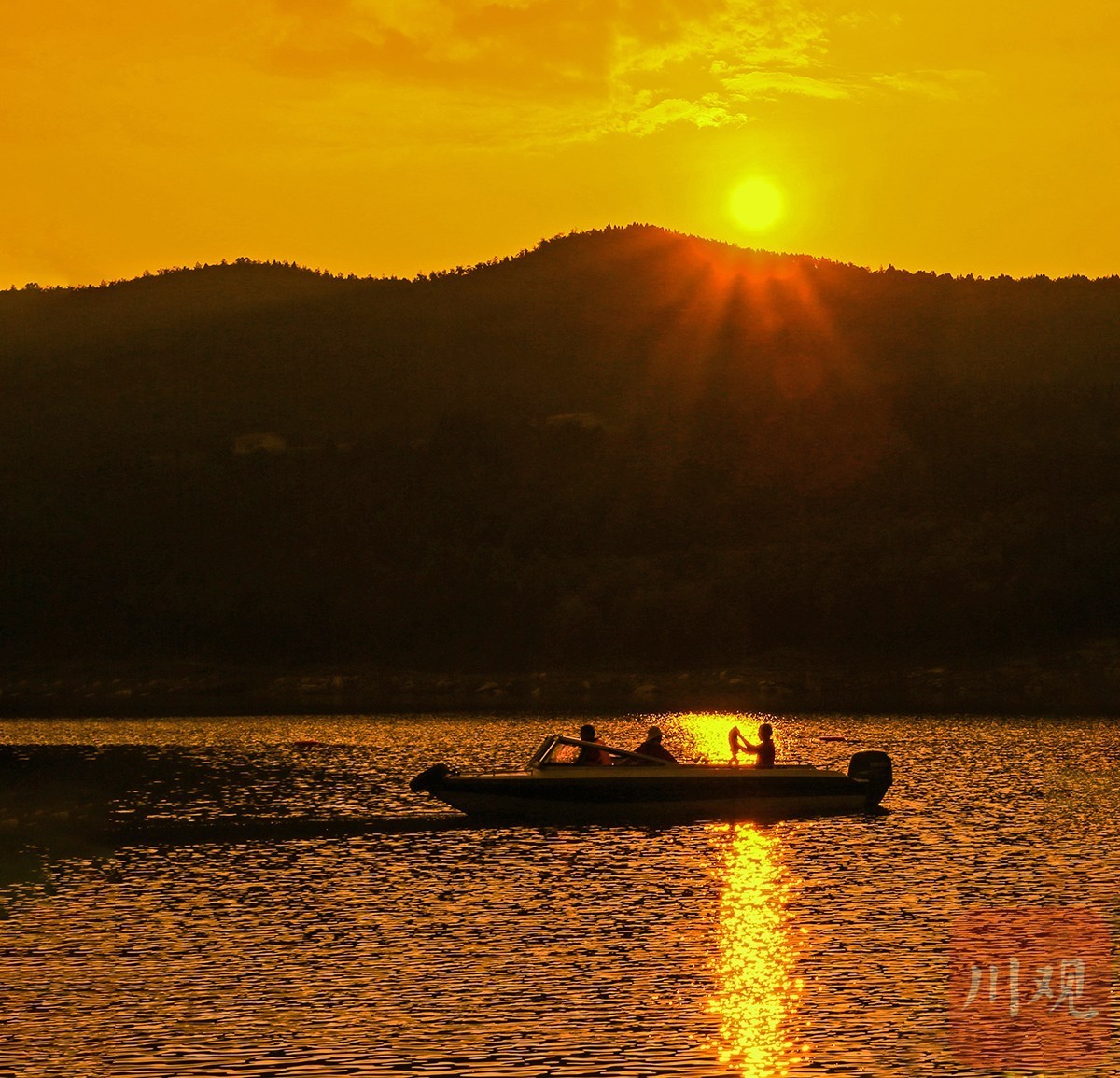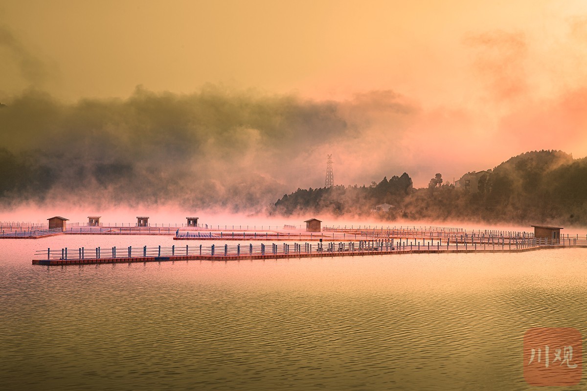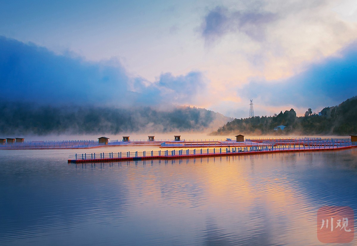 初冬的晨曦染红了剑阁县嘉陵江上的亭子湖,湖水在朝阳的映衬下显得格外漂亮。
