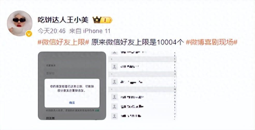 原来,当晚网友“吃饼达人王小美”发文称,通过自己的实测,微信好友上限是10004个。