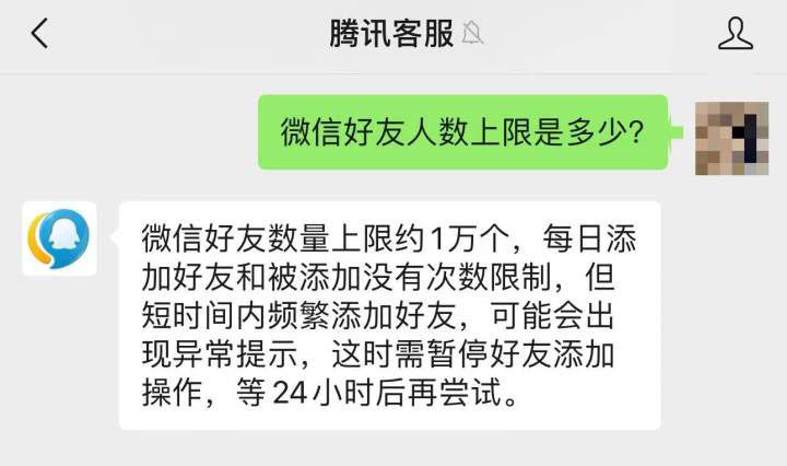 对此,腾讯客服回应称:微信好友数量上限约1万个,每日添加好友和被添加没有次数限制,但短时间内频繁添加好友,可能会出现异常提示,这时需暂停好友添加操作,等24小时后再尝试。