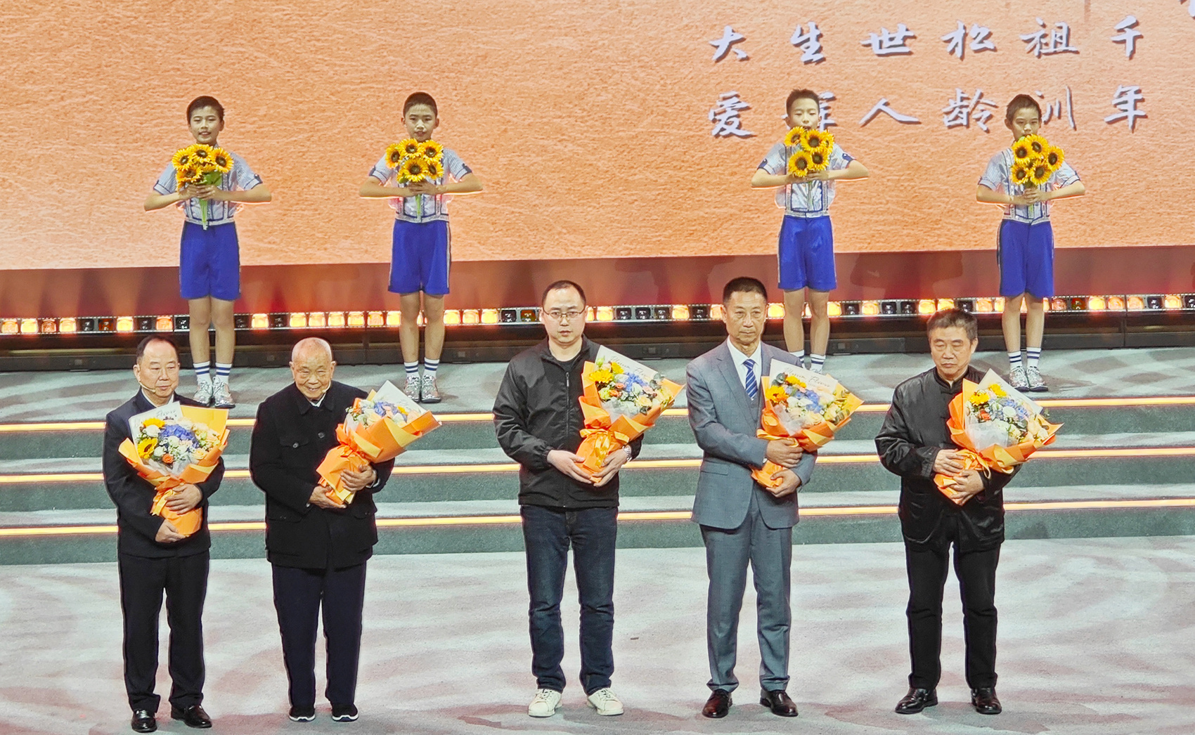 周永开(左二)和儿子周南生(左一)上台领奖(邱斌锋/摄)