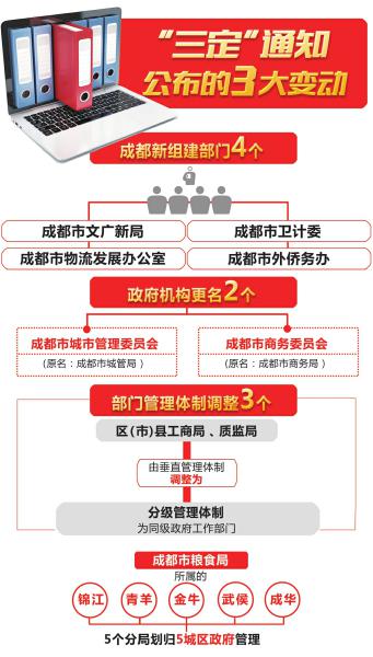 涉及成都机构改革的11个部门中,8个部门公布了“三定”通知。除成都市文广新局、成都市卫计委、成都市外侨务办正在拟定“三定”通知外,其余机构改革已全部完成。
