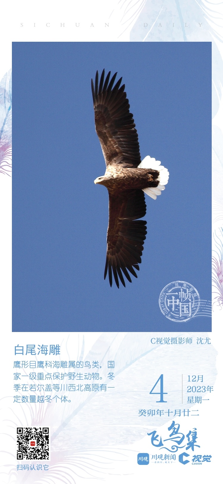 冬季在若尔盖等川西北高原有一定数量越冬个体,2018年冬曾经有一只白尾海雕在成都平原过冬纪录。