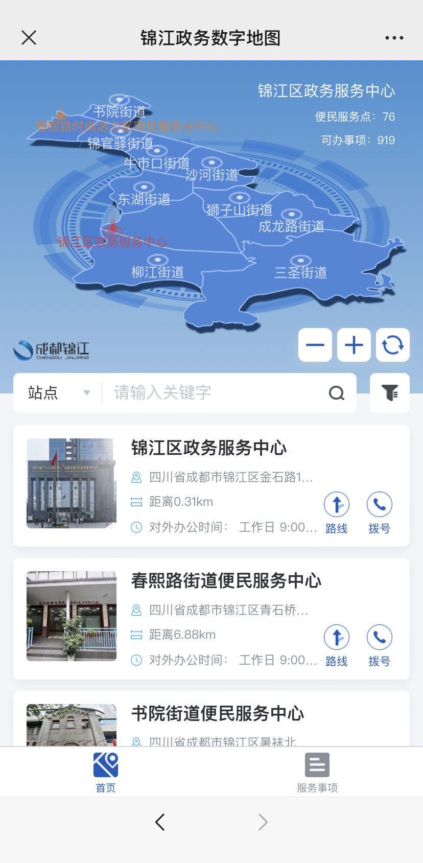 据悉,锦江区政务服务数字地图是基于“锦江服务”微信公众号建设的智慧便民数字地图,汇聚三级政务服务体系——1个区级政务服务中心,11个街道便民服务中心及76个社区便民服务站的资源信息,直观展示站点具体地址、实景照片、咨询电话、办公时间、办事指南等20余项要素信息。
