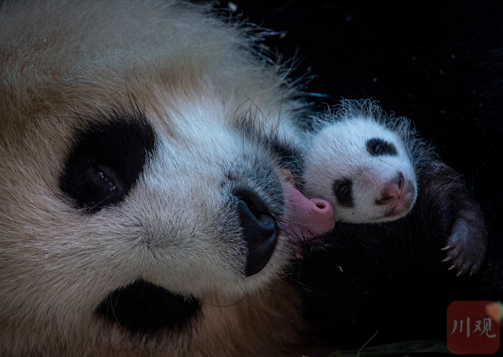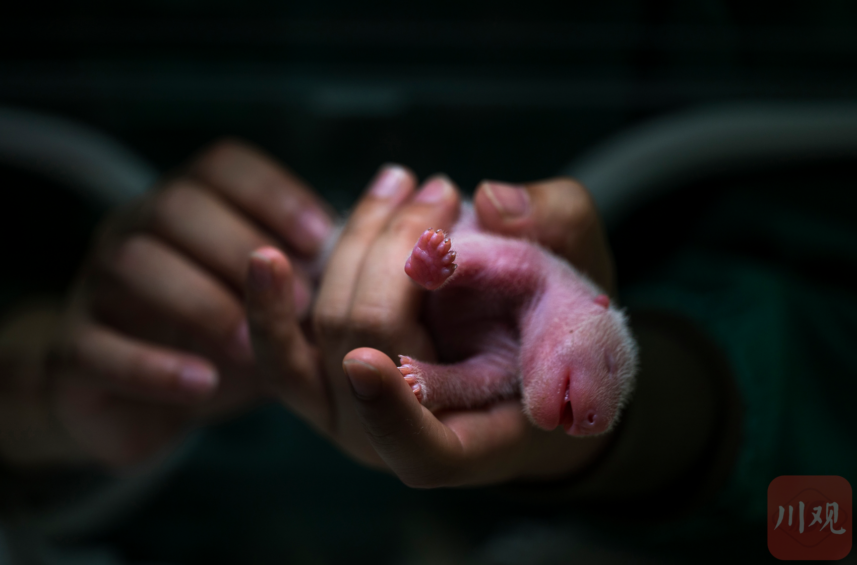 2022年7月12日,中国大熊猫保护研究中心神树坪基地,科研人员检查刚出生大熊猫幼崽的身体状况。