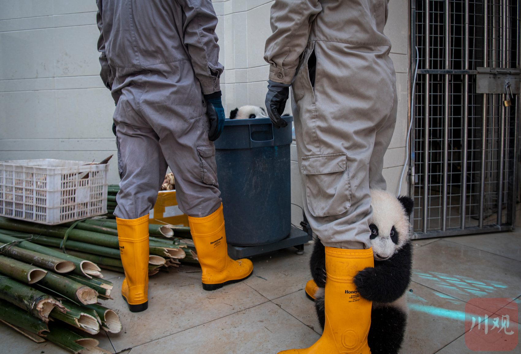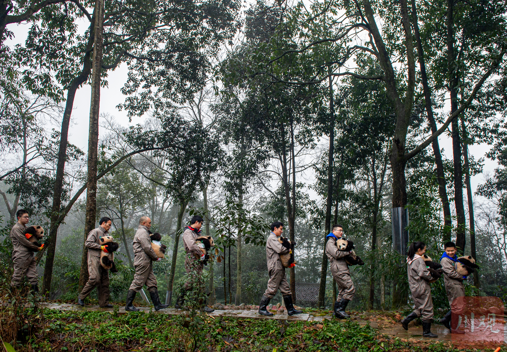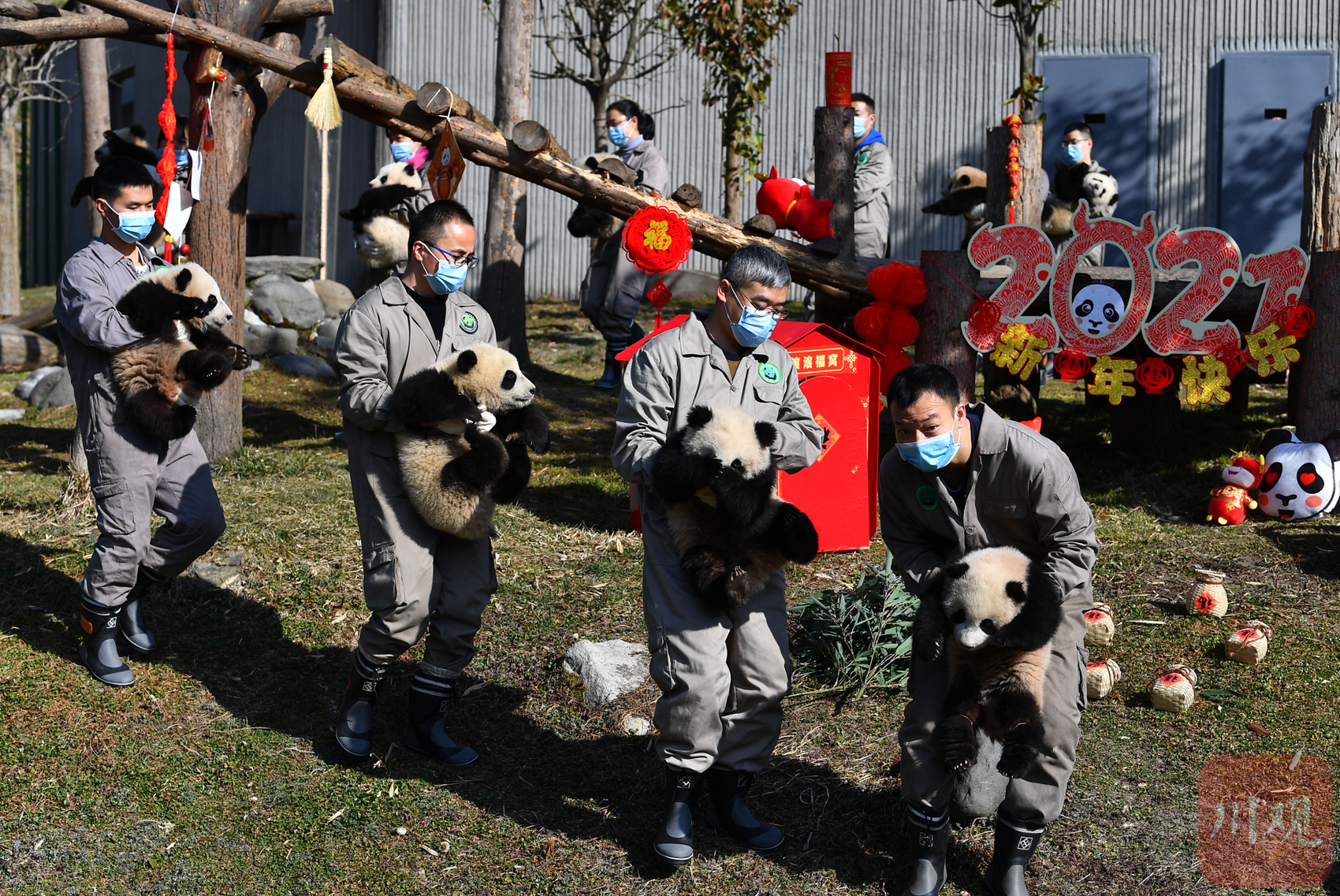 2021年2月3日,中国大熊猫保护研究中心神树坪基地,科研人员怀抱10只新生大熊猫亮相。