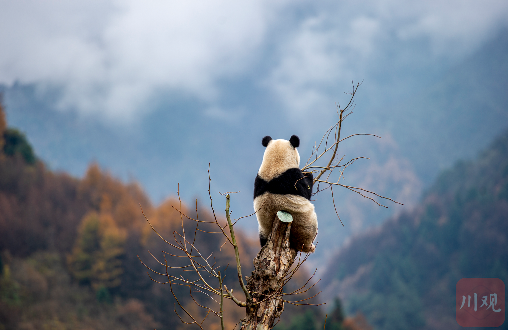 2014年11月28日,中国大熊猫保护研究中心神树坪基地,一只大熊猫望着远方。当年,因为汶川大地震离开四川卧龙国家级自然保护区的10多只大熊猫回到故乡。