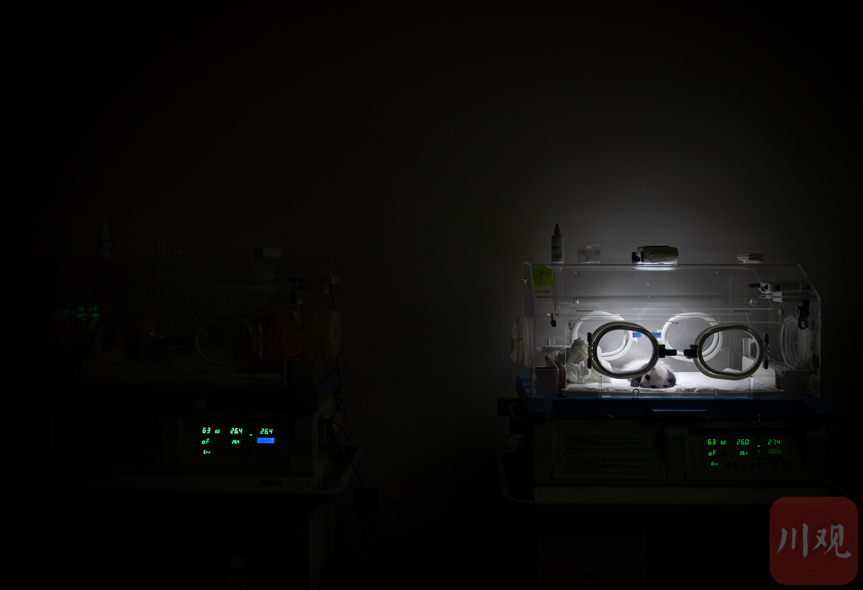 2021年8月16日,中国大熊猫保护研究中心神树坪基地,一只一个月大的熊猫幼崽在育幼箱中。