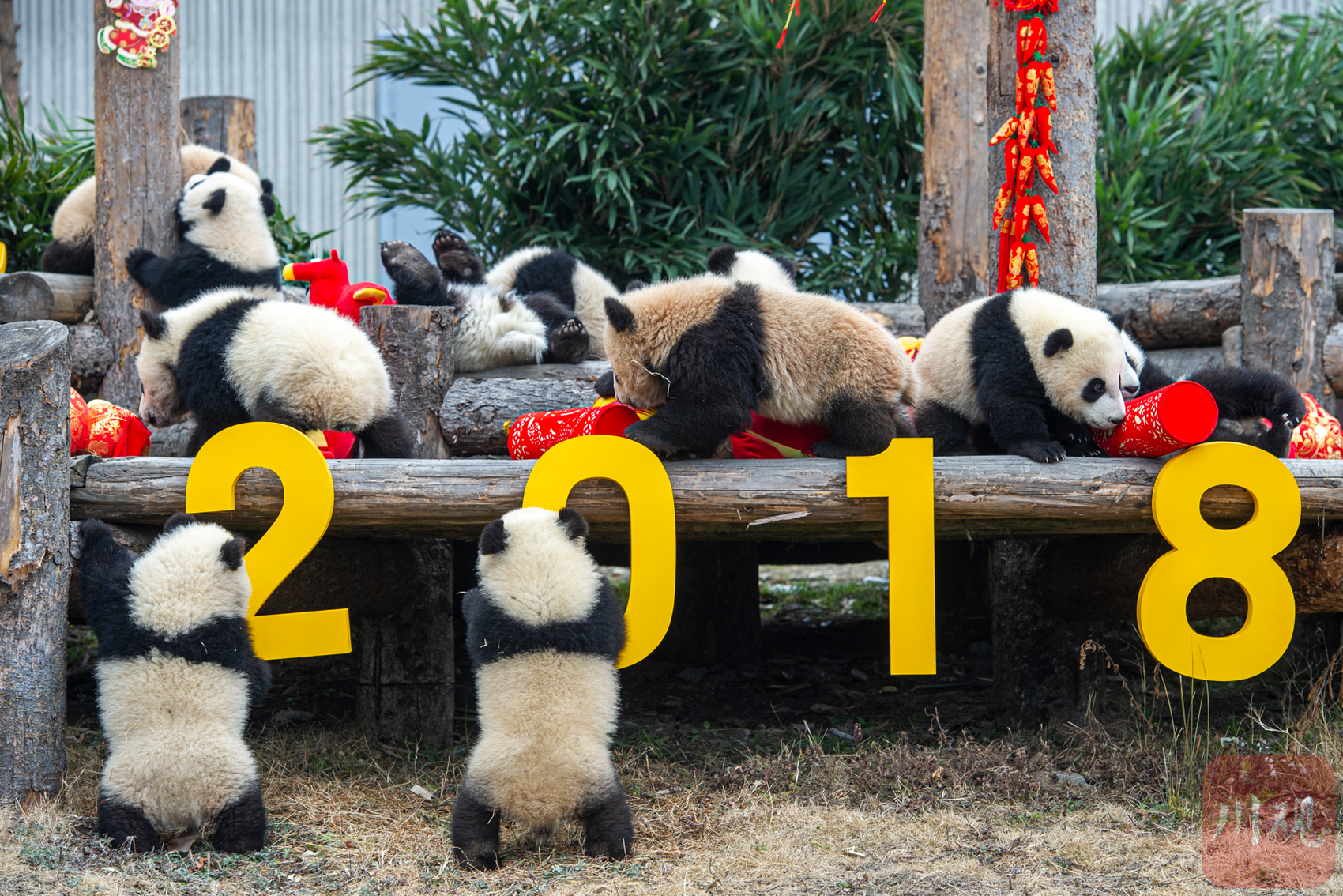 2018年2月14日,中国大熊猫保护研究中心神树坪基地,2017年出生的17只大熊猫集体亮相给全国人民拜年。