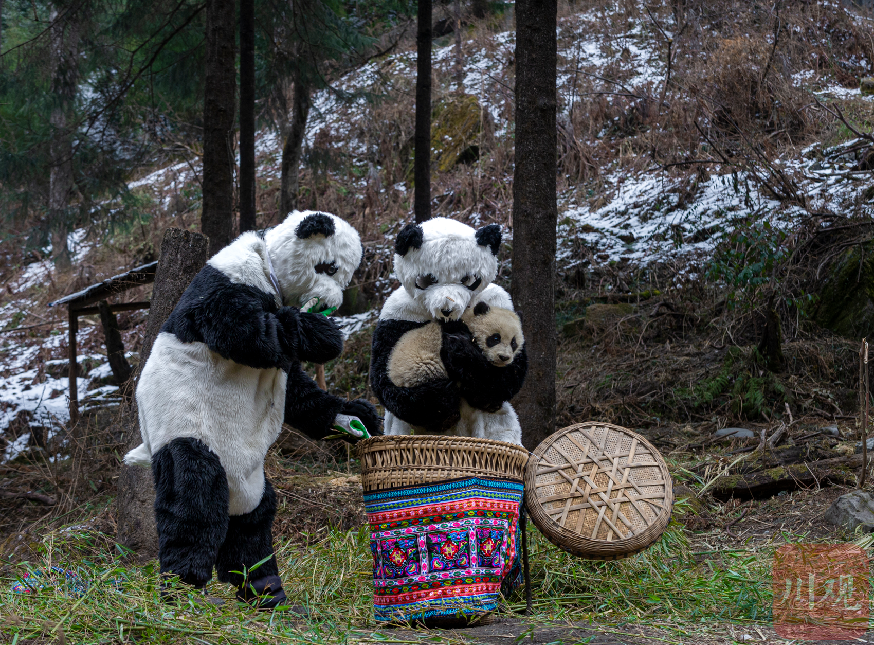2011年2月19日,中国大熊猫保护研究中心核桃坪基地,身穿熊猫服的科研人员将半岁的大熊猫淘淘放入背篓中,准备将其转移到野训二期基地。