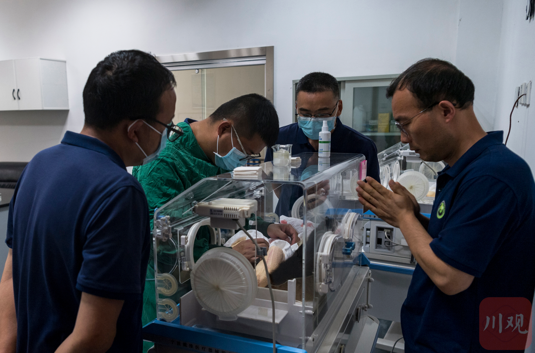 2022年7月18日,中国大熊猫保护研究中心神树坪基地,科研人员一起观察出生的大熊猫幼崽。