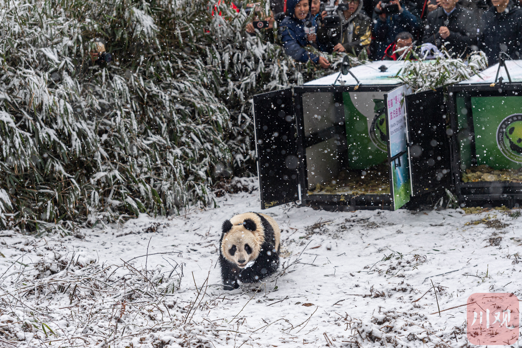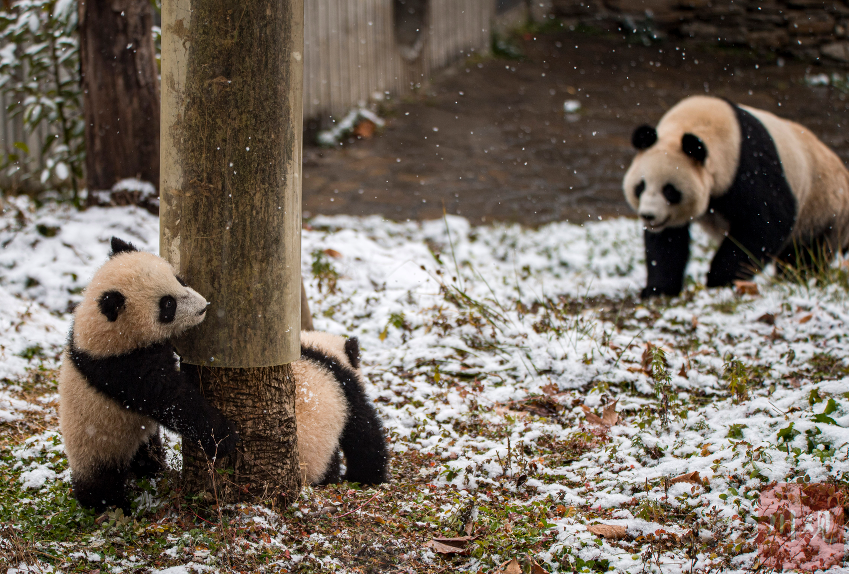 2021年12月26日,中国大熊猫保护研究中心神树坪基地,一对新生双胞胎大熊猫在雪中玩耍。