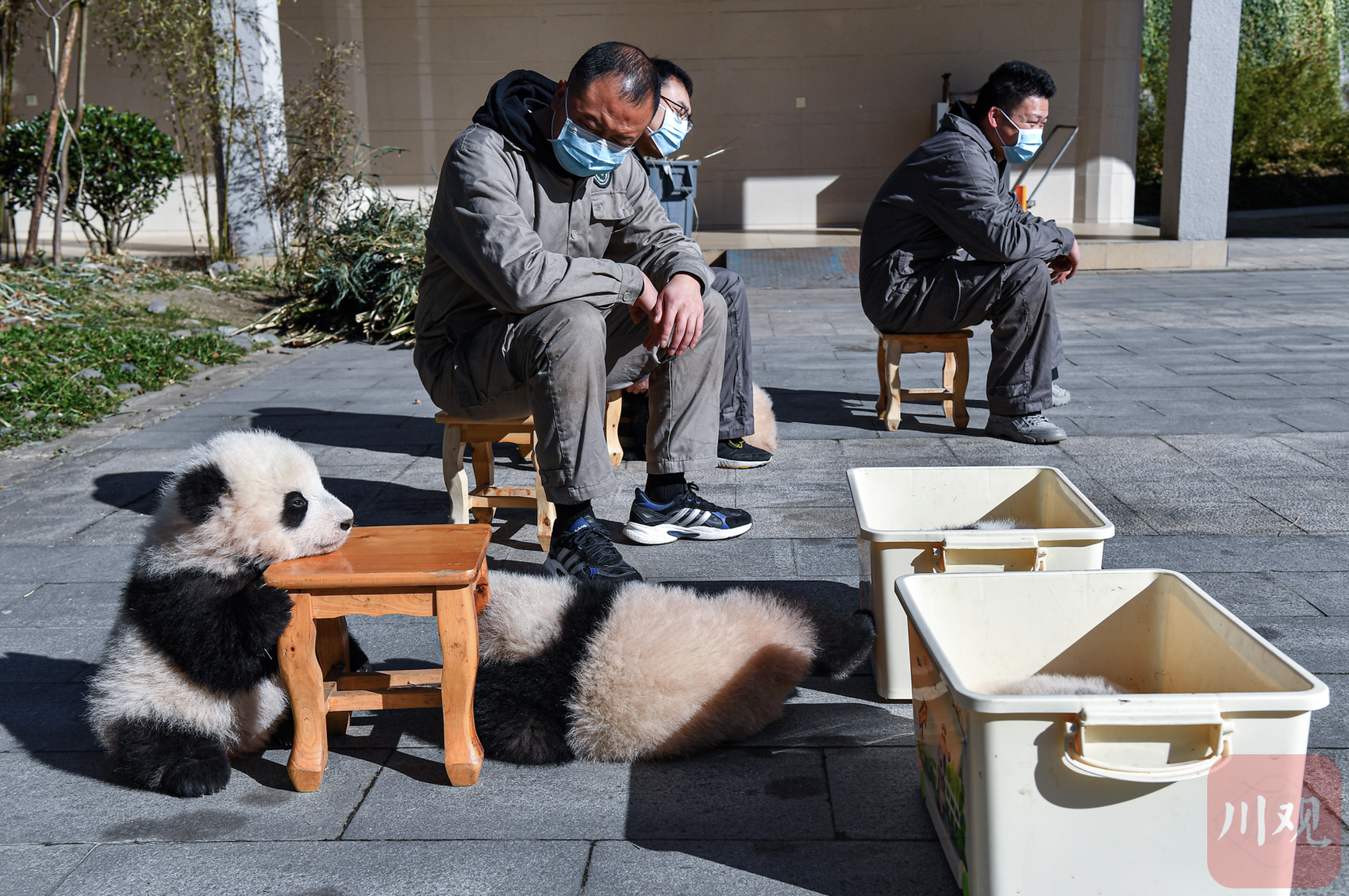 2021年12月22日,中国大熊猫保护研究中心神树坪基地,两只新生大熊猫在科研人员的看护下晒太阳补钙。