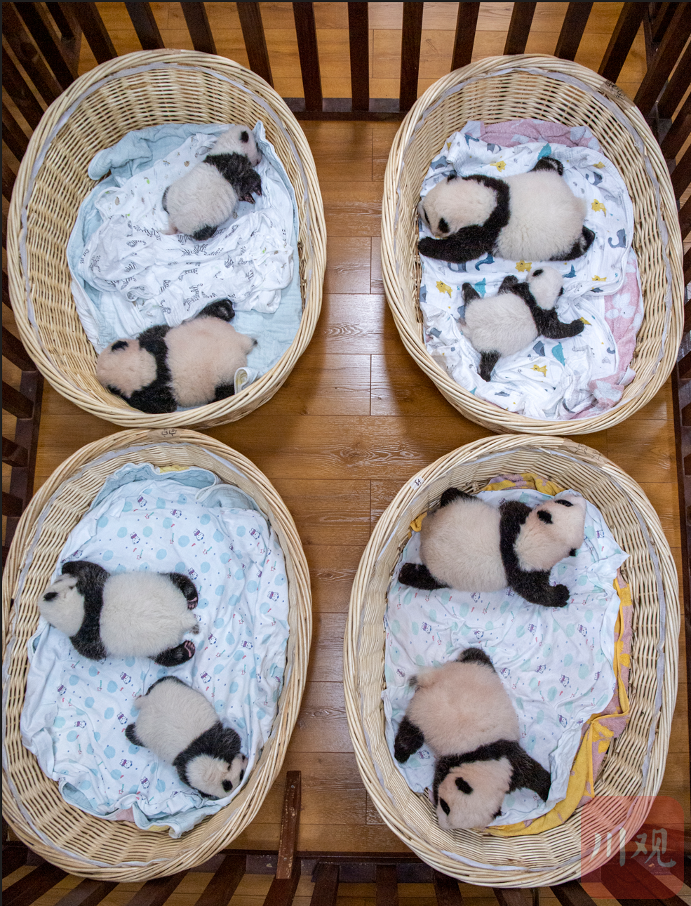2021年9月16日,中国大熊猫研保护究中心神树坪基地,大熊猫育幼室中的4对双胞胎。