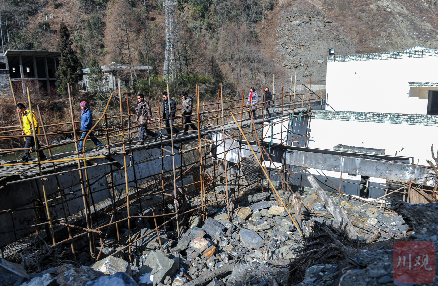 2011年2月2日,中国大熊猫保护研究中心核桃坪基地,科研人员走在临时搭建的便桥上,汶川大地震给基地的基础设施带来极大破坏。