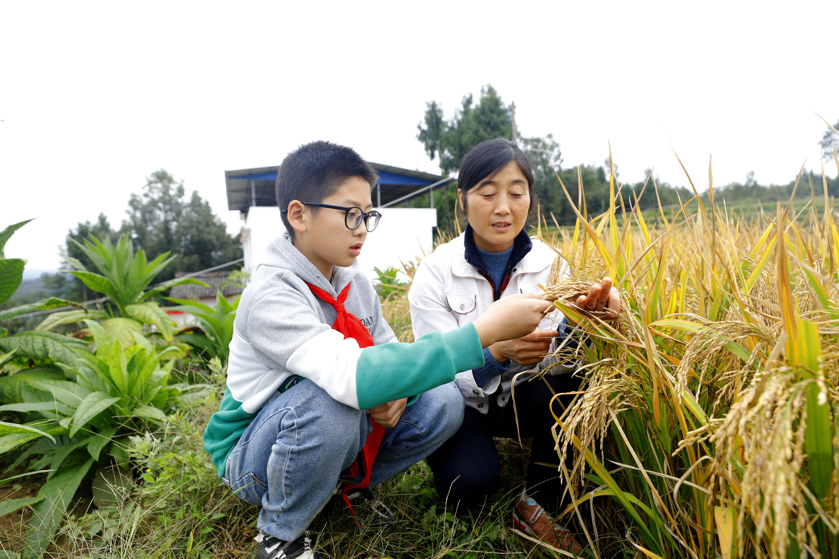 蒲丽蓉(右)向小儿子讲述种粮的艰辛。闫靖摄