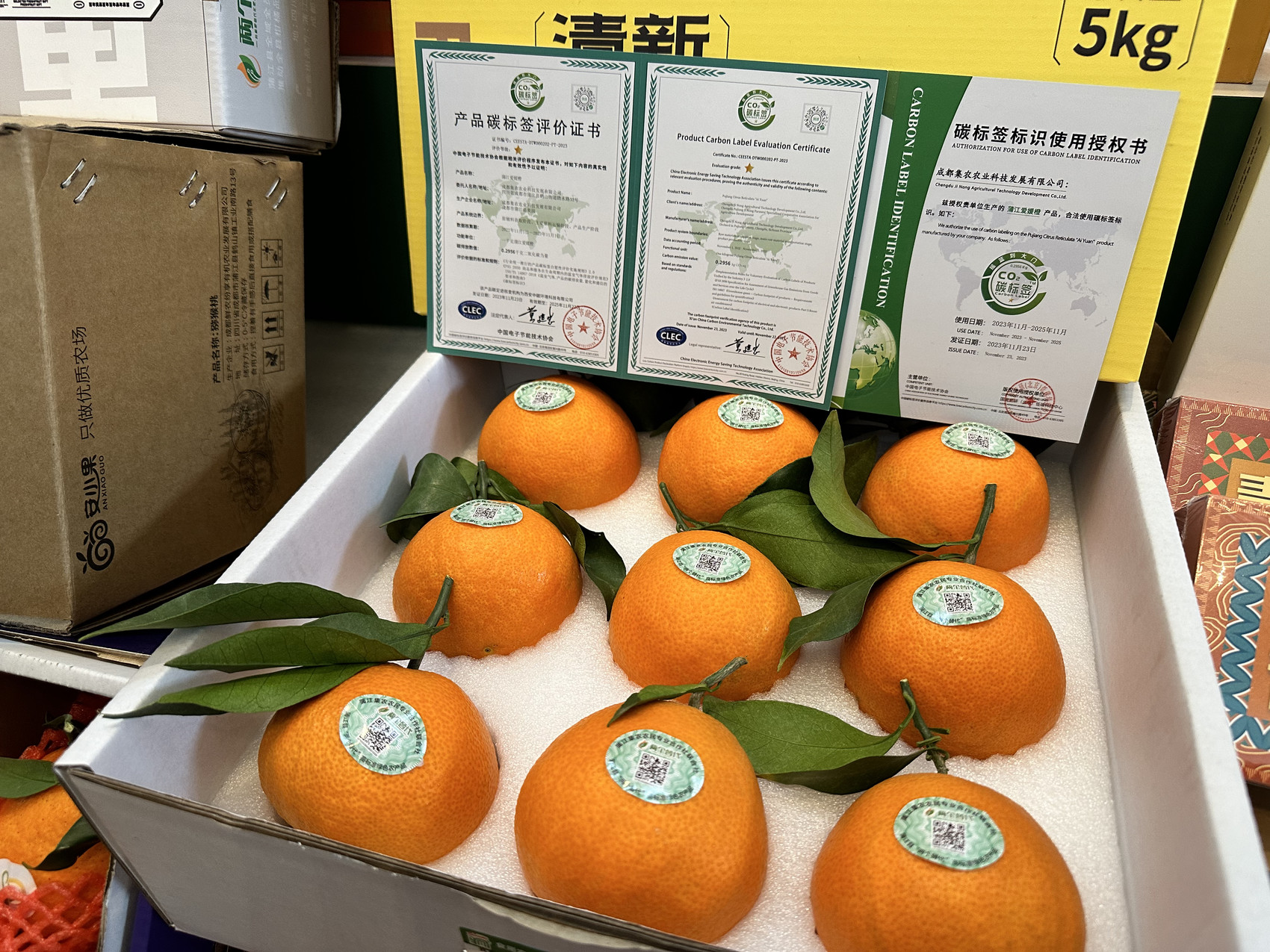 九分甜一分酸的蒲江爱媛橙,眼下正是销售旺季。12月3日,在蒲江县举行的2023第十一届品牌农业发展国际研讨会会场,蒲江爱媛橙以新的形象亮相——它获得了由中国电子节能技术协会颁发的 “碳标签”认证,成为全国橙类水果首个“碳标签”农产品。