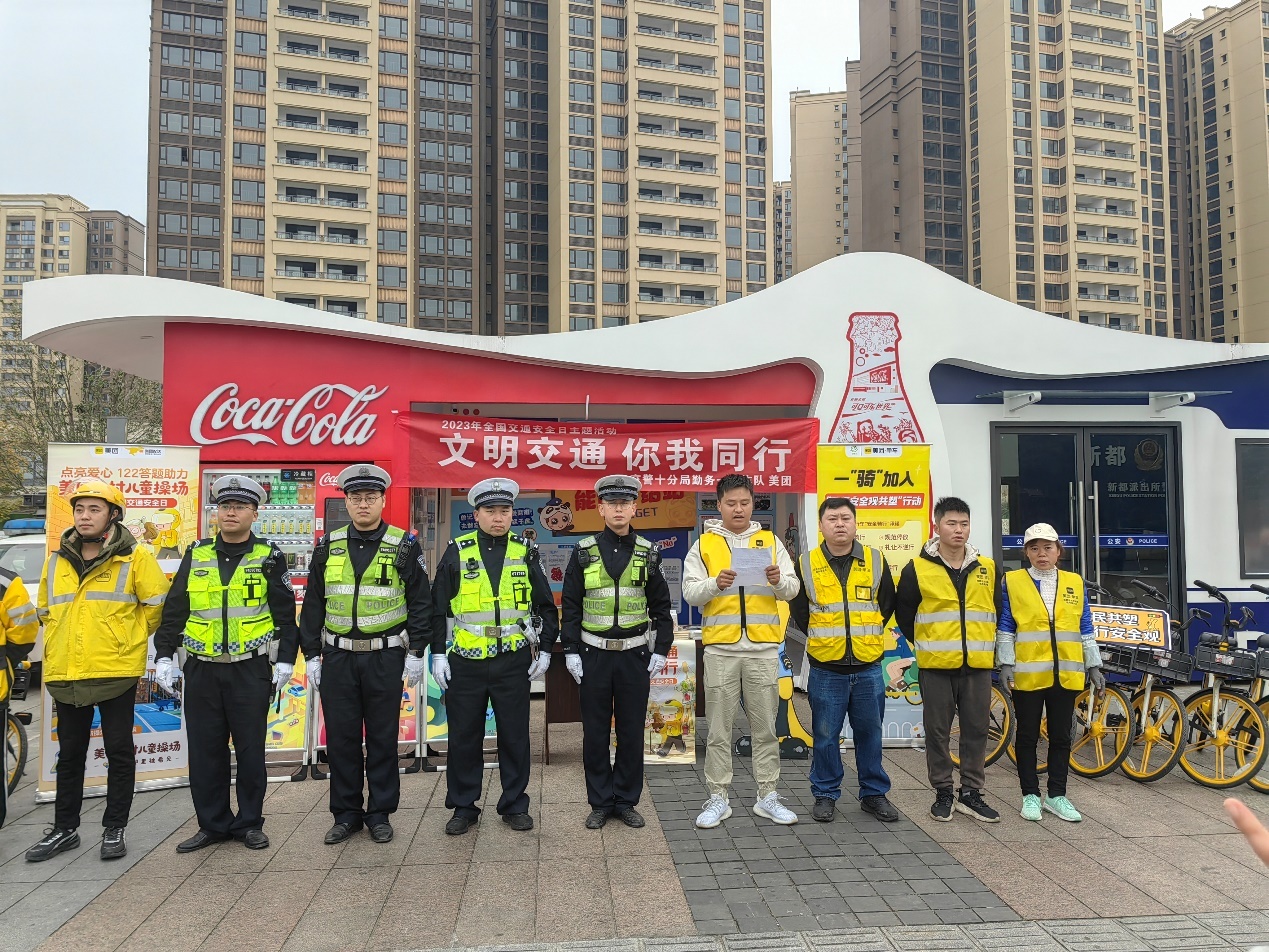“文明骑行我参与,争做文明出行畅行者,不逆行、不争抢,规范停放共享单车,把文明风尚传播到城市的每一个角落。”在新都区的活动现场,勤务一工作队与美团单车共同倡议社会文明骑行,遵守交通规则。