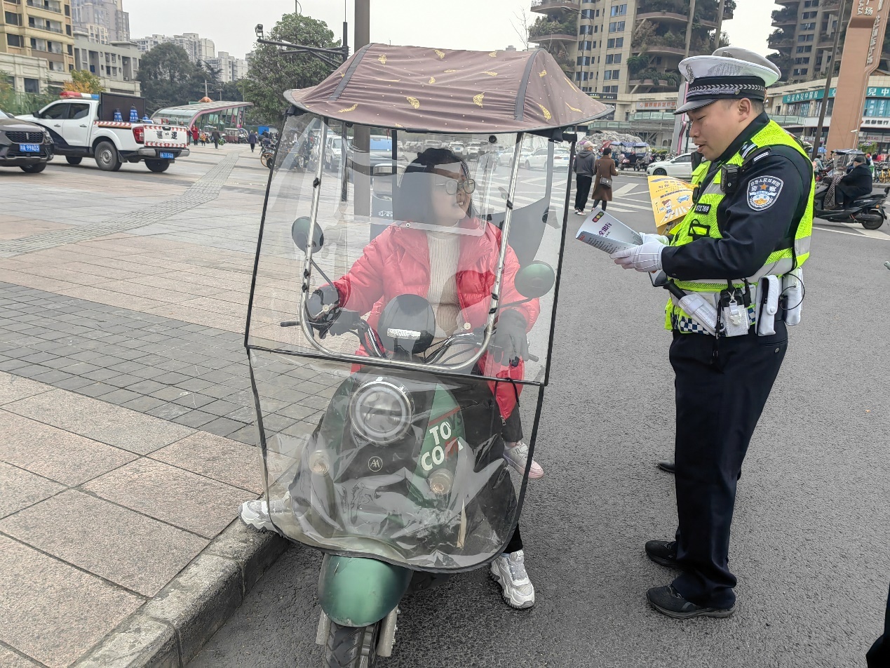 交警十分局民警向群众发放交通安全倡议书。