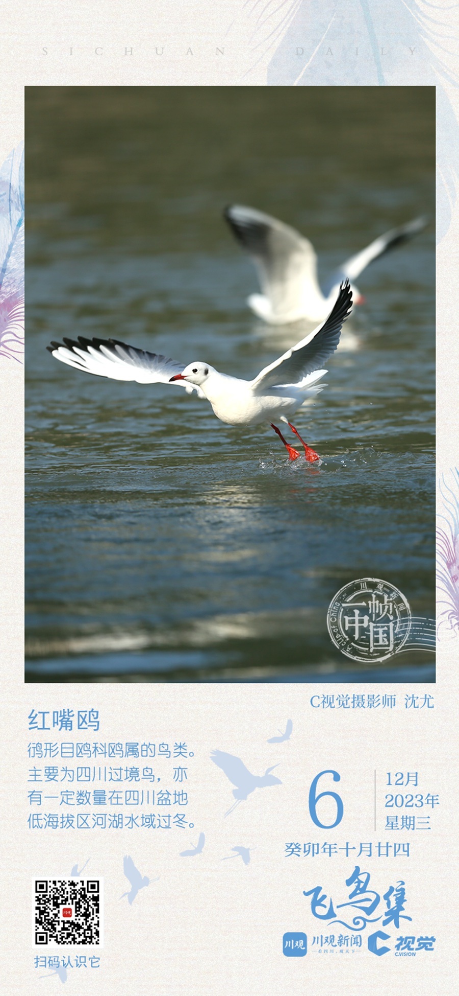 水上精灵红嘴鸥,展翅高飞踏碧波。蹁跹南迁越寒冬,天府之国宝地多!