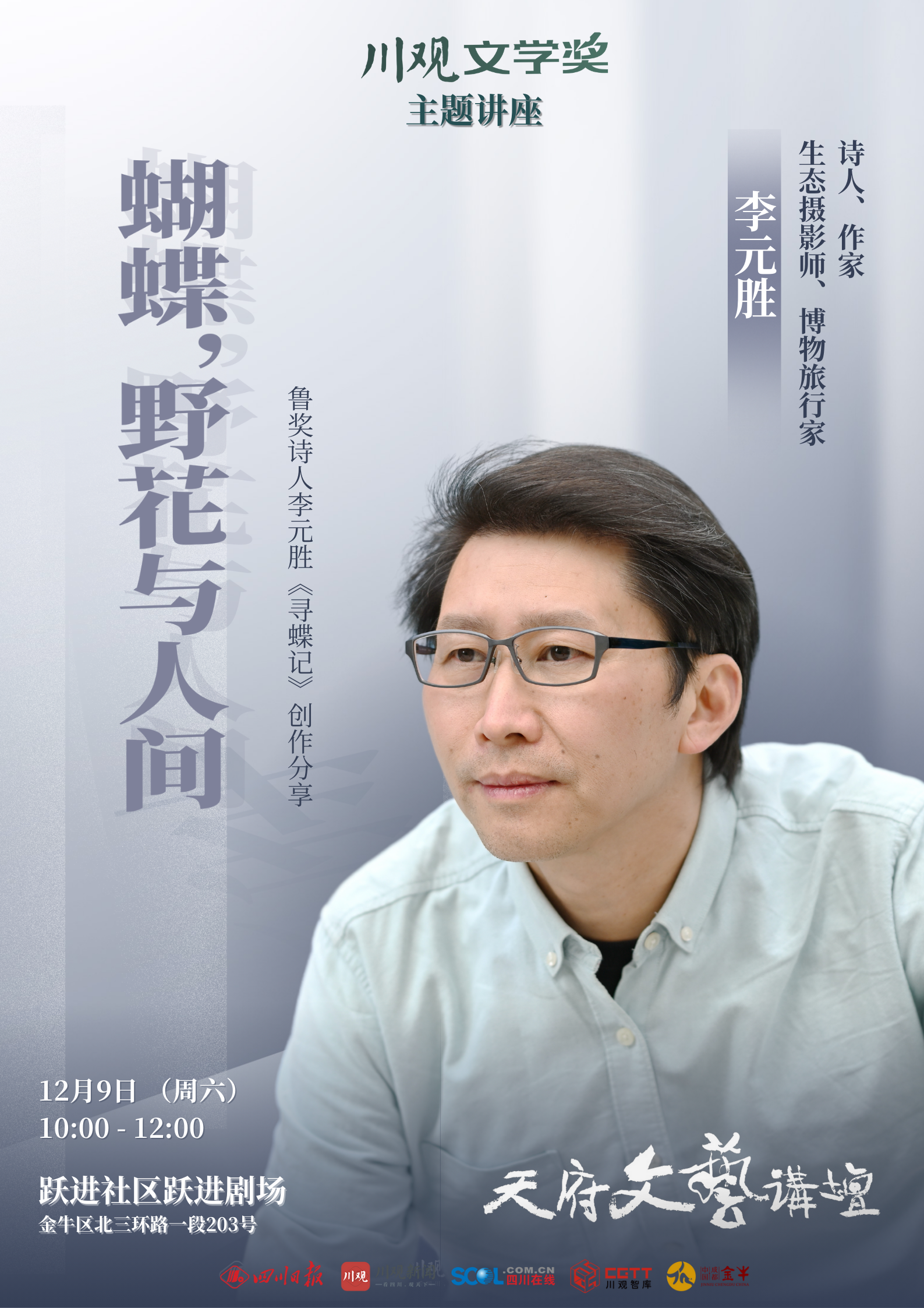 12月9日上午10点,与李敬泽同时开讲的还有鲁迅文学奖得主、著名诗人李元胜,他也是川观文学奖(2022年度)散文奖获得者。在金牛区的书香社区——跃进社区,李元胜将带来“蝴蝶、野花与人间——鲁奖诗人李元胜《寻蝶记》创作分享”。李元胜是诗人,更是博物旅行家。他写下《我想和你虚度时光》的缠绵缱绻,也写下《精灵物语》《雨林秘境》《万物闪耀》的生生不息……《寻蝶记》是李元胜的最新著作,积累数十万字蝴蝶生态观察笔记。在本次讲座上,李元胜在分享寻蝶奇遇记的同时,还将公开大量珍贵的照片。