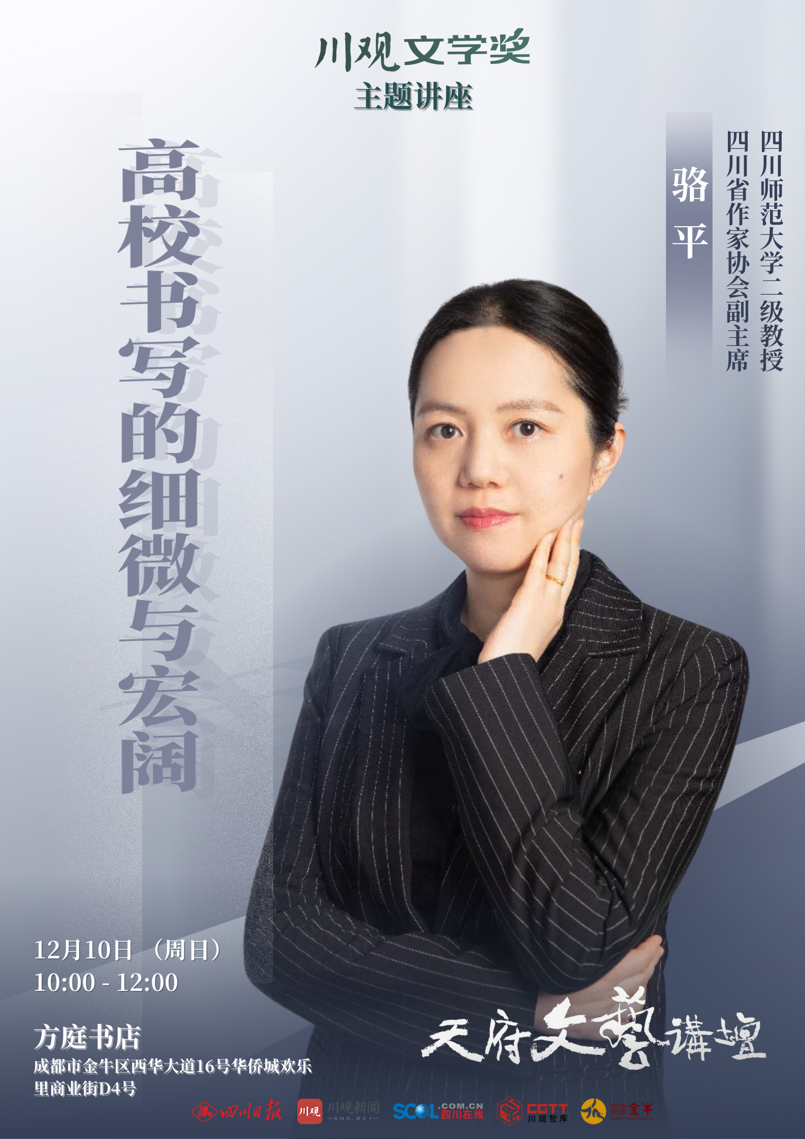 12月10日上午10点,川观文学奖(2022年度)小说奖获得者、四川师范大学教授、知名女作家骆平将以“高校书写的细微与宏阔”,在方庭书店开讲。象牙塔是一个既有当代性,又有主体性的议题,是考察当下创作与文学传统乃至文化传统关系的极佳对象。过去十余年,骆平聚焦高校题材进行文学创作,极具典型性和辨识度。本次讲座,骆平漫谈高校书写,呈现高校生活的全息影像。