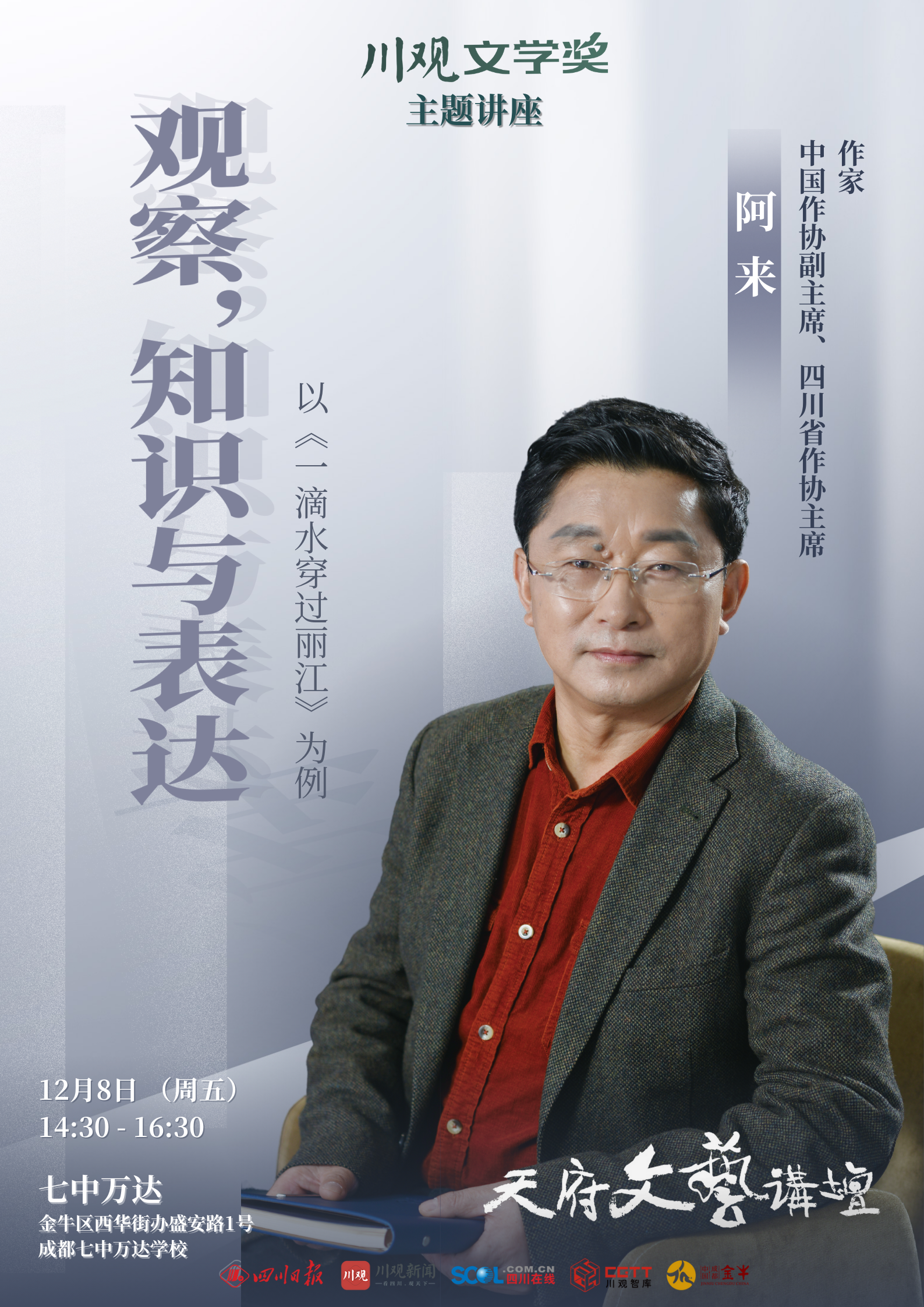 12月8日下午2点30分,川观文学奖评委会副主任,中国作协副主席、四川省作协主席阿来,将在成都七中万达学校开讲,主题为“ 观察,知识与表达一一以《一滴水经过丽江》为例”。《一滴水经过丽江》是阿来的一篇散文,首发于四川日报,并入选了八年级下册语文教材,成为学生们的必读课文。在文章中,阿来化身一滴水,以水的踪迹为线索,全方位展现了丽江古城的自然风光、历史沿革和人文景观,构思新颖,视角独特。这一次,阿来将走上讲台,为成都七中万达学校八年级的孩子们亲自上这堂“语文课”。