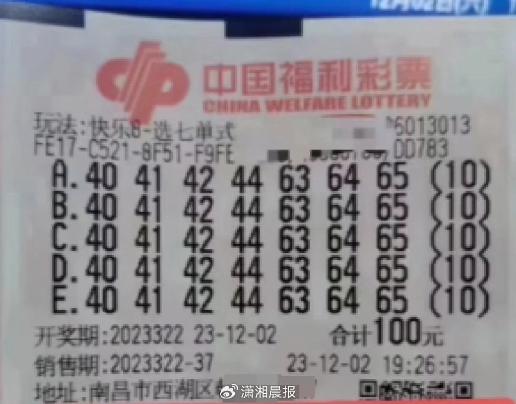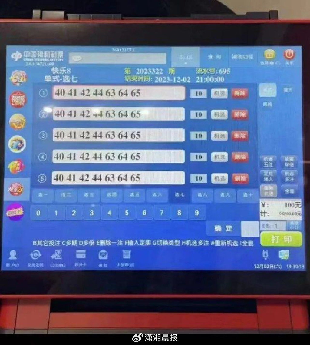 一张网传终端机截图显示,12月2日,有人在“快乐8”选七玩法中,一次性购买“40、41、42、44、63、64、65”数共98500元(49250注)。还有一张网传彩票截图显示,12月2日,在南昌市西湖区一家彩票店,有人在“快乐8”选七玩法中,一次性购买同一串数字共100元(50注)。