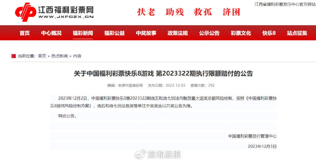 12月3日,中国福利彩票发行管理中心曾发布一则“关于中国福利彩票快乐8游戏 第2023322期执行限额赔付的公告”称: