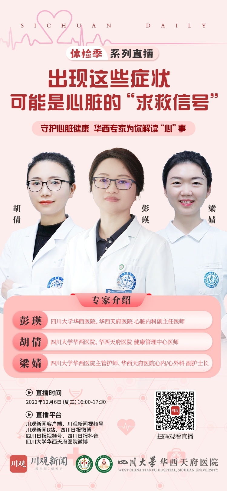 12月6日16:00,川观新闻携手四川大学华西天府医院开展健康科普直播,邀请心内/心外科、健康管理中心专家们科普心脏疾病的防治与护理,解读体检/检查报告,回答大家的疑问,助您更好守护心脏健康。