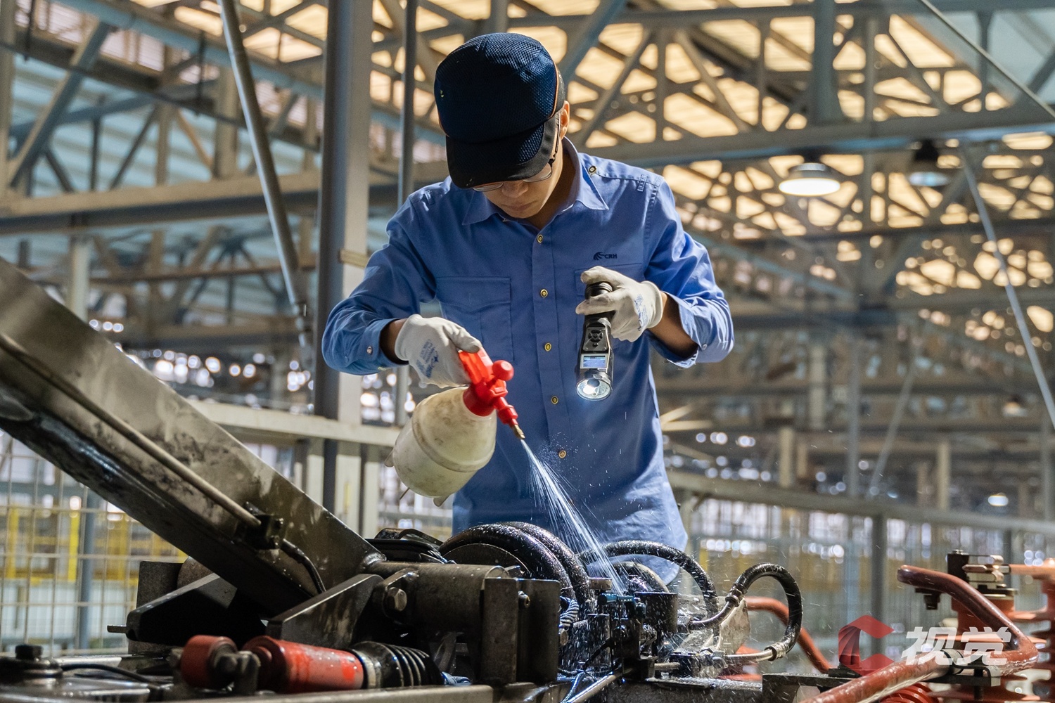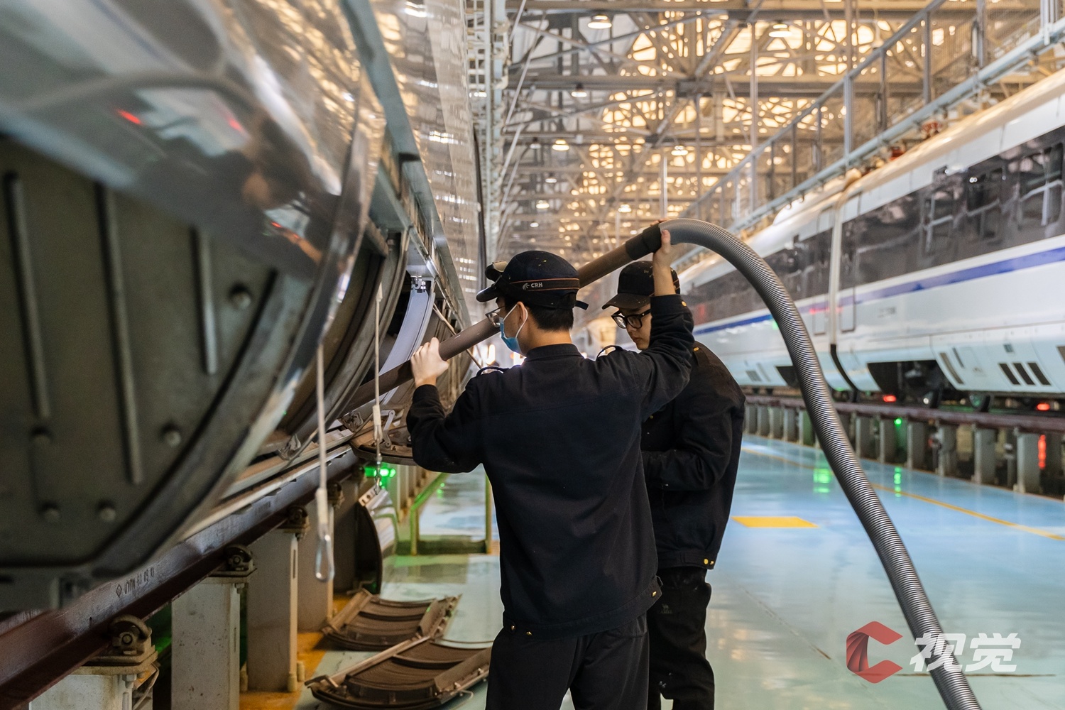动车组机械师对CRH2G型高寒动车组车下设备舱进行整备