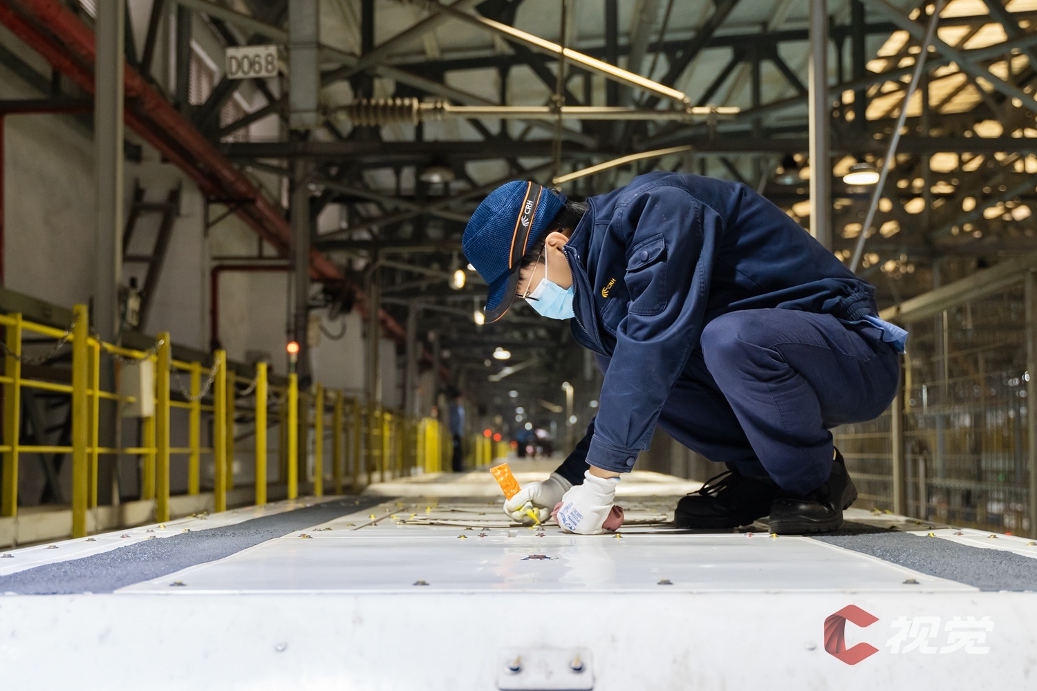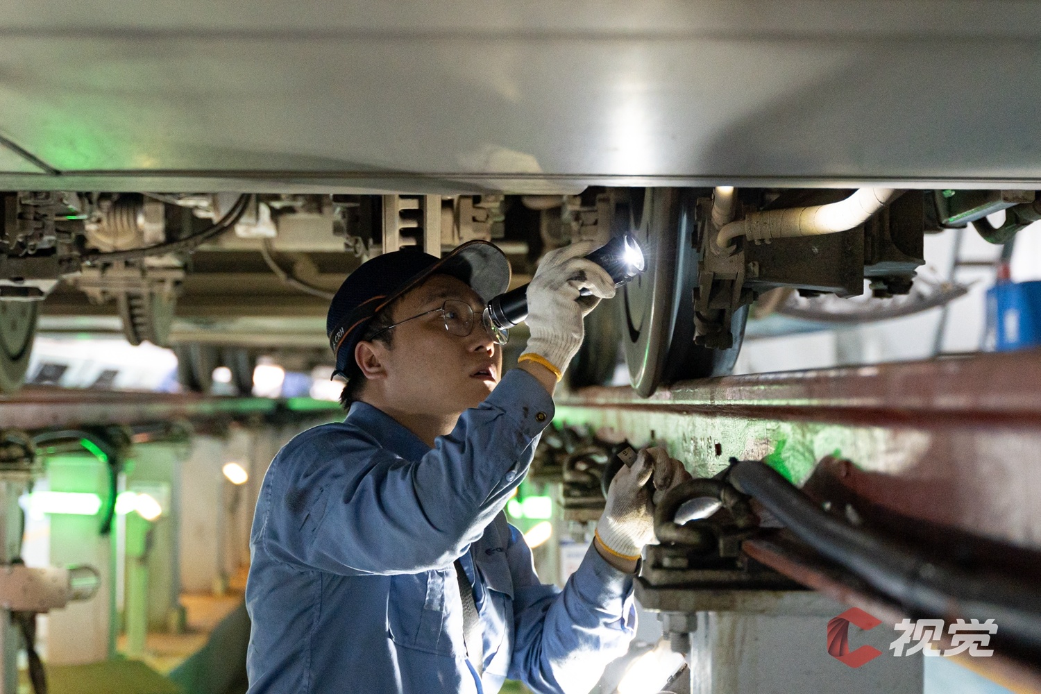 动车组机械师对CRH2G型高寒动车组走行部进行检查