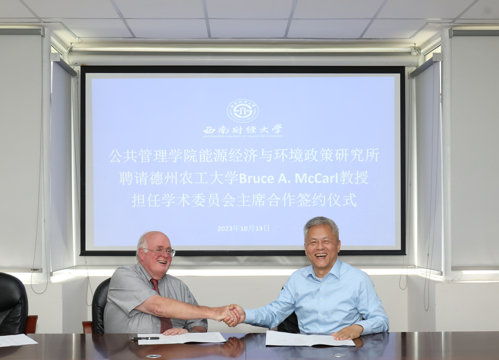 今年10月,团队聘请美国得克萨斯农工大学布鲁斯·麦克卡尔教授任学术委员会主席。图为签约仪式现场,左为麦克卡尔教授,右为陈建东教授。