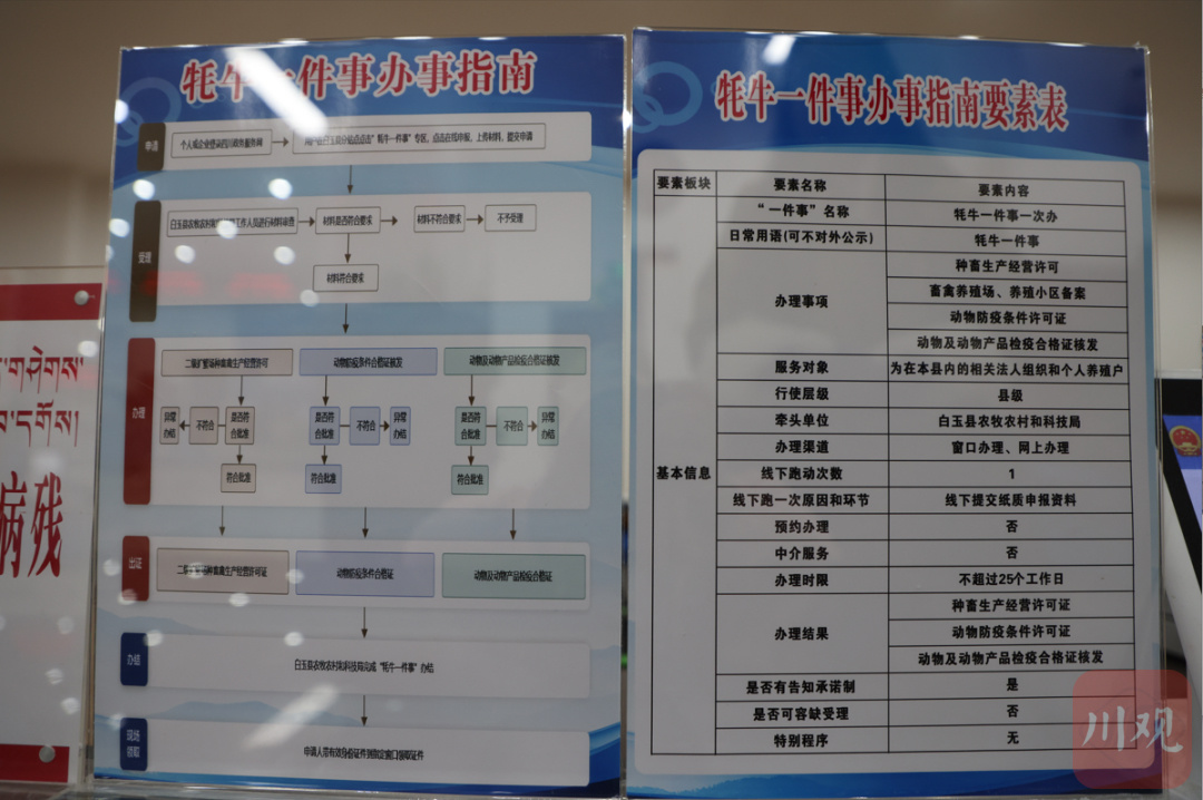 藏汉双语导向图、办事指南展示架......12月5日,走进白玉县政务服务中心 “牦牛一件事”综合办理窗口,全面公开办理流程、办理条件、办理时限等信息映入眼帘,群众一眼便能了解流程。