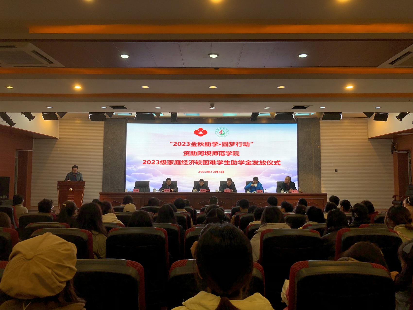 12月4日,四川省关工委、省关心下一代基金会在阿坝师范学院举行2023“金秋助学、圆梦行动”助学金发放仪式,精准帮扶该校2023级100名家庭经济较困难学生。