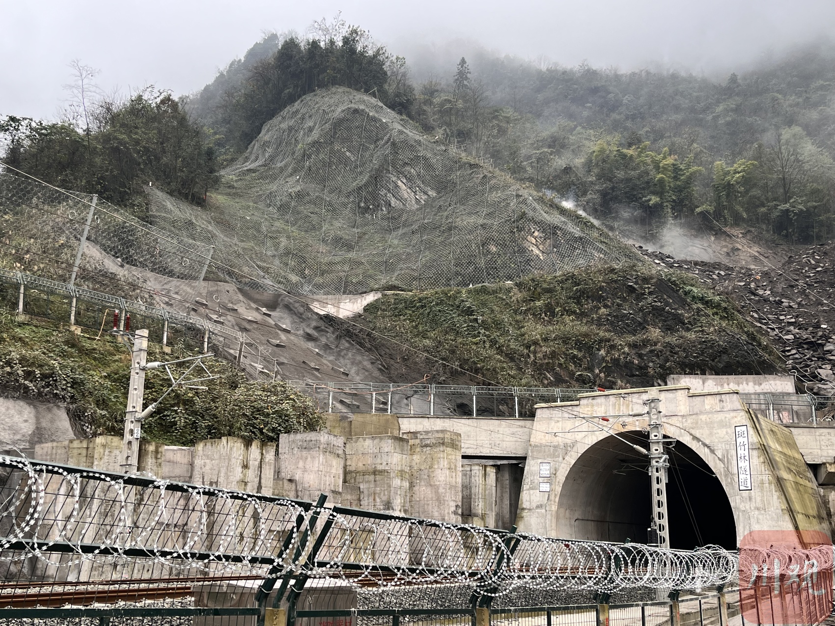 对于叙毕铁路施工团队来说,除了在山谷间架起桥梁,突围山体打通隧道是另一重点工作。从云南省威信县北向驱车近一小时山路,记者来到斑竹林隧道入口处,可以看到隧道入口上方是一处断层,一面遍布树林,一面装有防护网用于接下山体掉落碎石,此时斜坡上仍有多名工作人员在进行最后的外部安全处置工作。