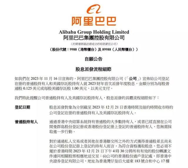 12月6日,阿里巴巴发布公告称,将向截至2023年12月21日香港地区时间及纽约时间收市时登记在册的普通股持有人和美国存托股持有人,就2023财年首次派发年度股息,金额分别为每股普通股0.125美元或每股美国存托股1.00美元,以美元支付。根据财报披露,股息总额约为25亿美元。