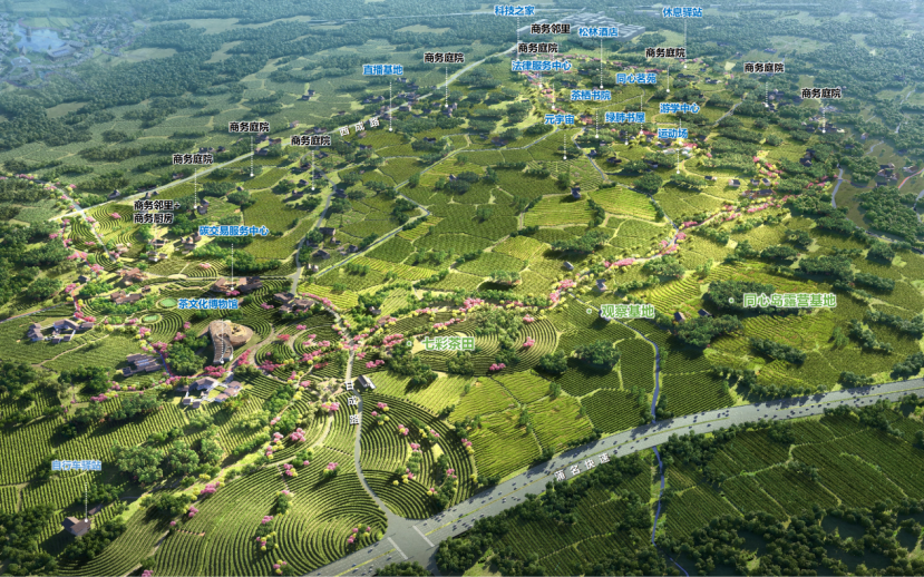 成佳郊野总部未来公园社区位于蒲江县成佳镇,规划面积约2.6平方公里。依托原生茶田、马尾松林景观本底,结合“三个做优做强”示范片区——成佳郊野总部重点片区建设,成佳郊野总部未来公园社区秉持“愿意来、留得住、保护好、可持续”原则,以建设“小而美”“小而精”“小而强”超大城市郊野总部为路径,构建“一核(一个国际化商务服务核心)、五片(五片总部林盘聚落)、三环(三条田园绿道环线)”空间结构,规划建设村旅共享服务、茶园活动体验、茶叶种植展示、茶野商务会客四大功能片区,打造“茶园里的会客厅”和多功能、复合型、无边界的城乡融合新型产业社区,目标是将其建成成都市绿色低碳新型办公郊野总部、公园城市理念乡村表达样板、生态价值多元转化示范标杆和未来公园社区郊野模式实践。